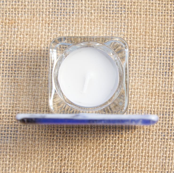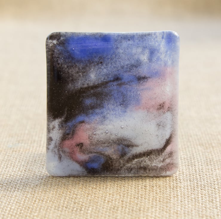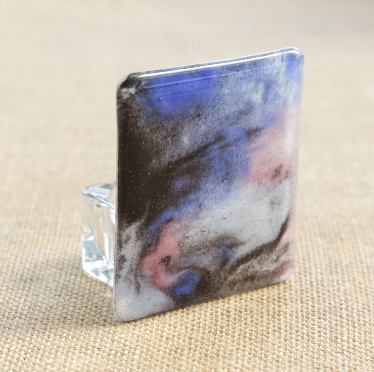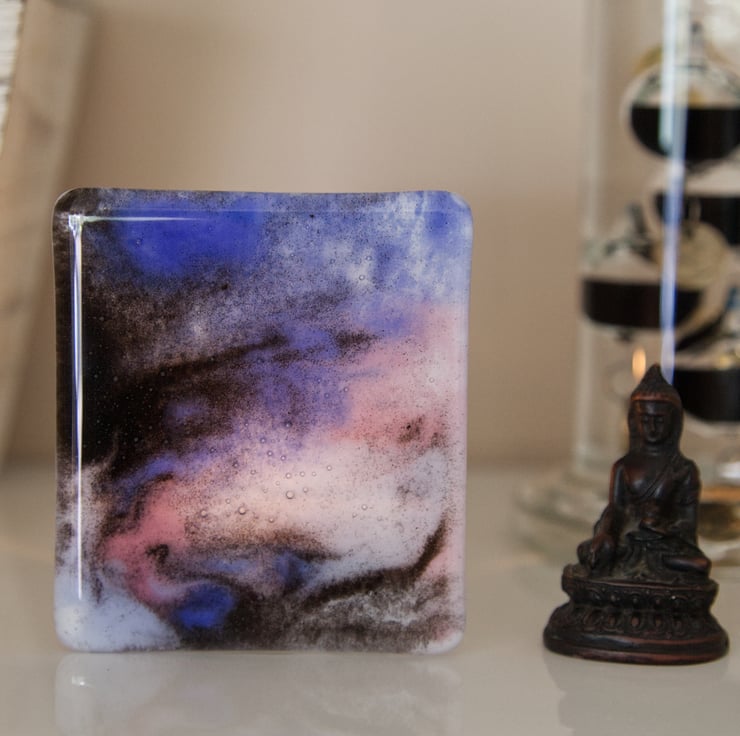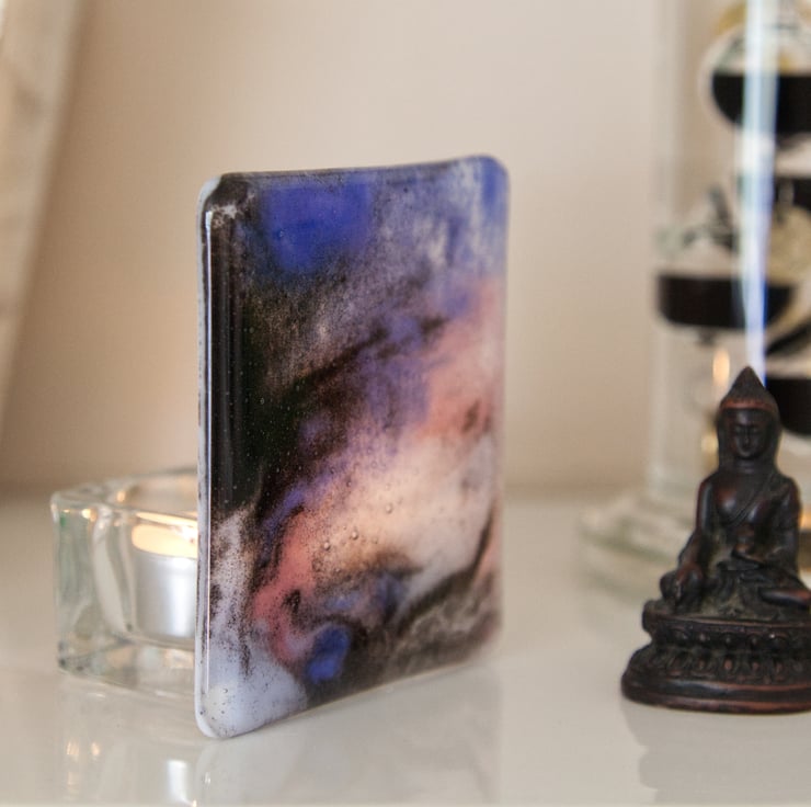 A stunning fused glass tea light holder with a galaxy/marbled patterned panel at the front. The colours have been made using powdered glass which has meant the colours can flow more, creating the abstract appearance. Black, lilac and pink glass has been used with white backing glass.