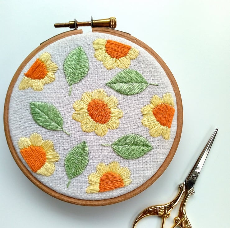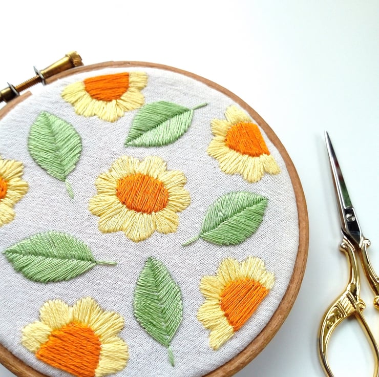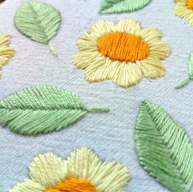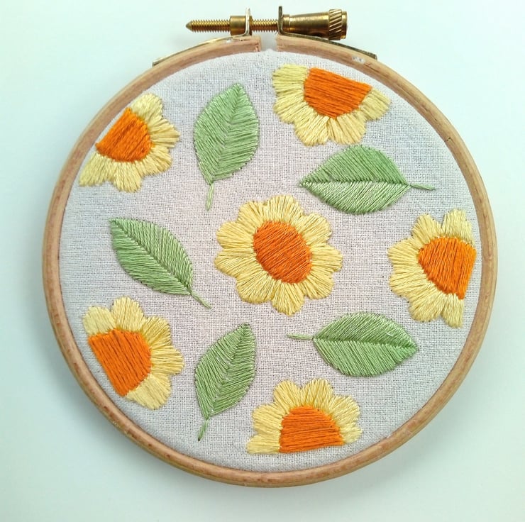 My own original, hand embroidered design, features bright yellow flowers with orange centres which are interspersed with fresh green leaves on a cotton calico background.