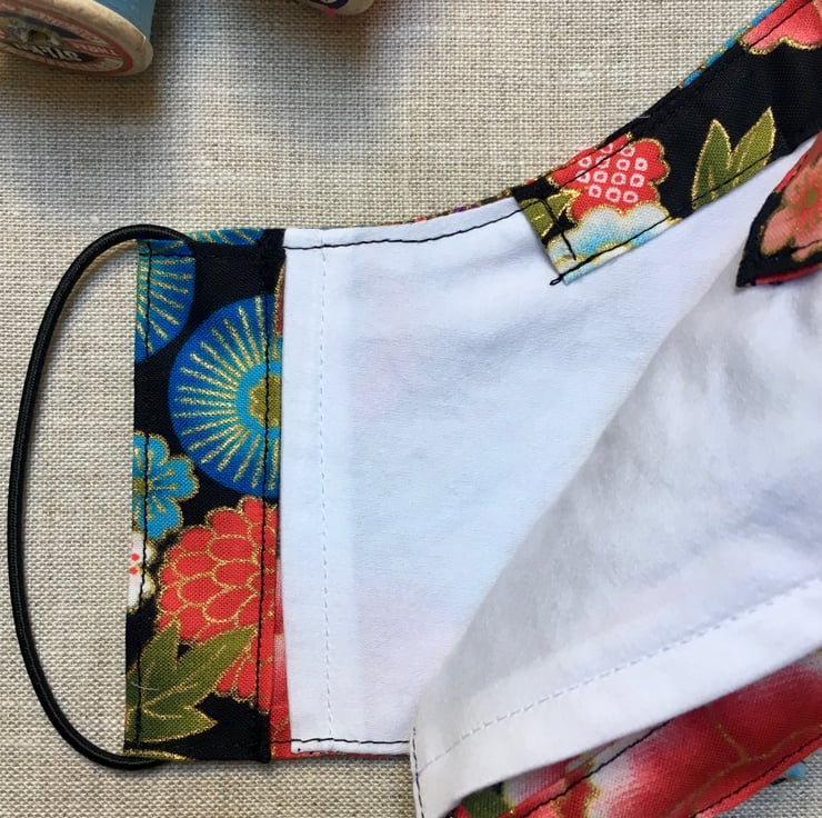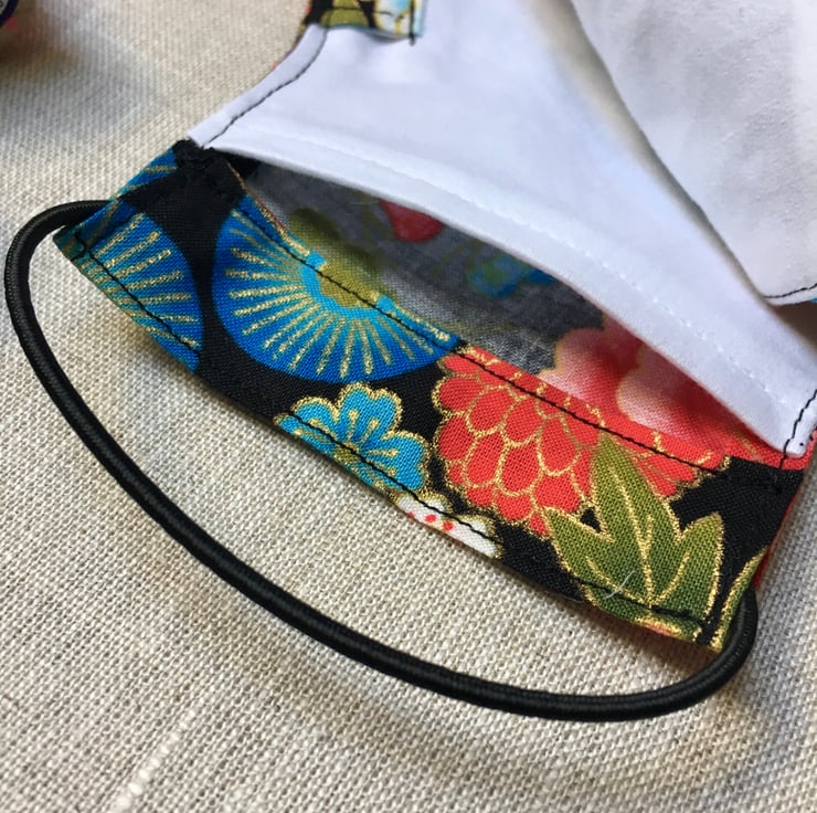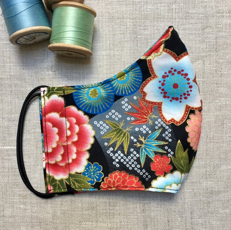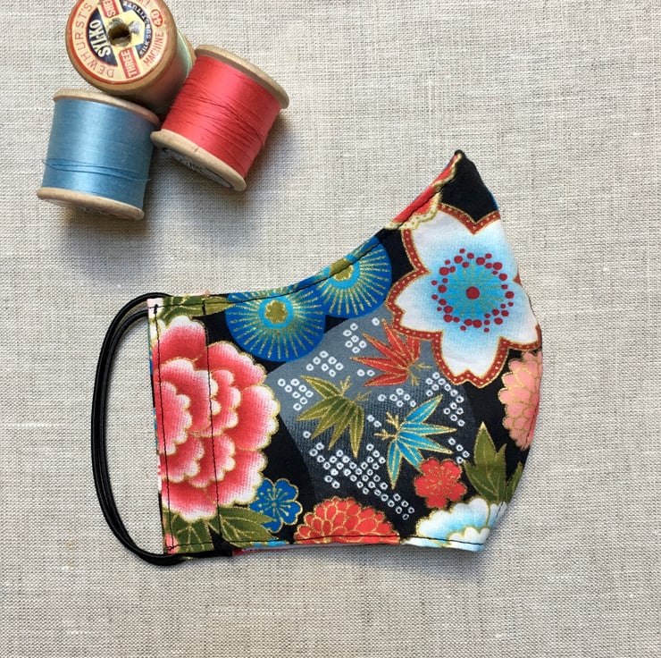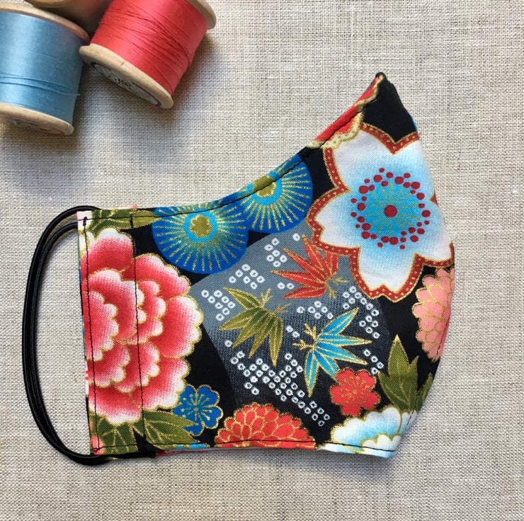 A stunning Japanese fabric with flowers and drums has been used to create this bright face mask. The fabric is 100% gilded high quality cotton and has gorgeous flowers of different colours and shapes. The mask has been lined with a 600 thread count cotton, which is soft against the skin. The mask is washable & reusable.