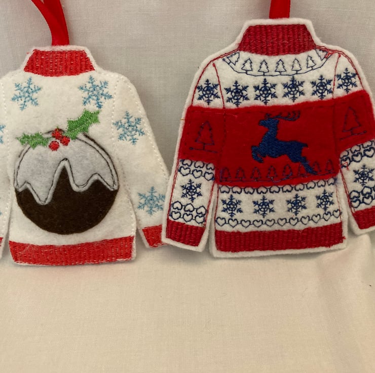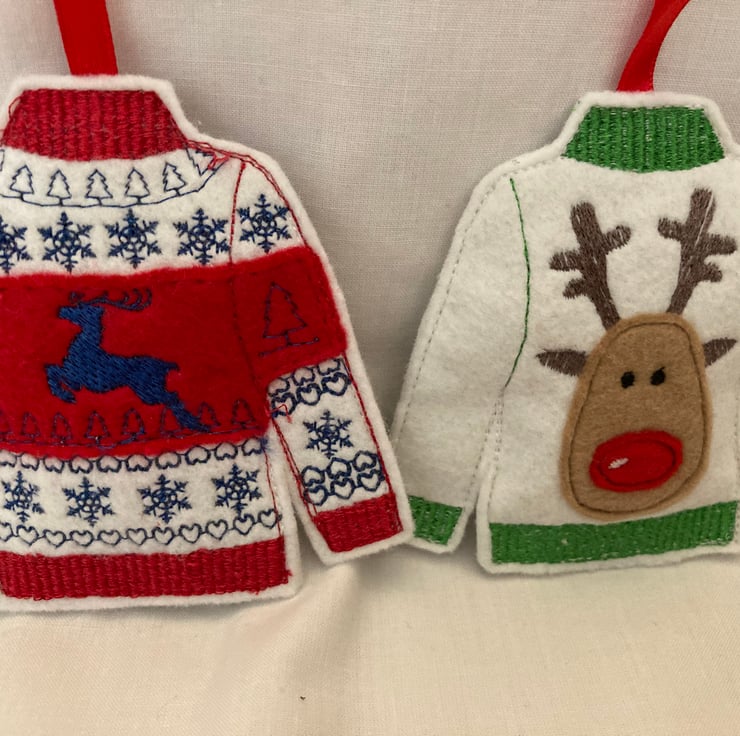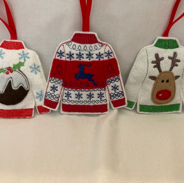 Embroidered felt Christmas jumper tree decorations, set of 3. Can be strung together to make bunting.
