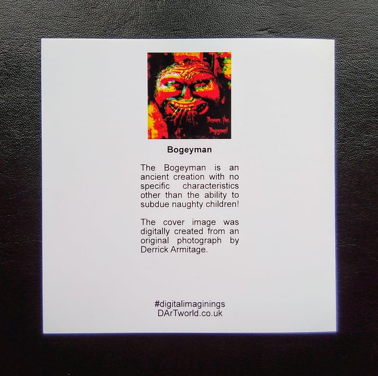Perhaps the most scary thing about the Bogeyman is that he has no specific characteristics and can appear in many guises. For centuries his threat has been used to subdue naughty children but this card might just make the grown-ups shriek!