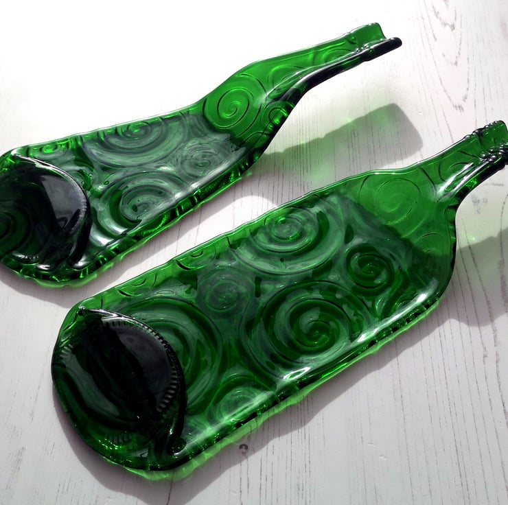 ‘Squashed’ bottle, made from recycled glass that has been melted to make a flat serving plate. A perfect upcycling, zero waste eco gift – reclaimed bottles transformed into environmentally friendly tableware.