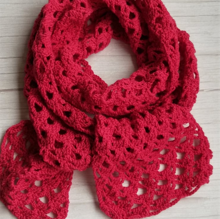 Made with high quality Jaeger merino wool, this attractive, crocheted scarf drapes beautifully. It is light and long, so will wrap twice around your neck then tied or can be wrapped once and worn lower at the neck, with the ends tied or left.