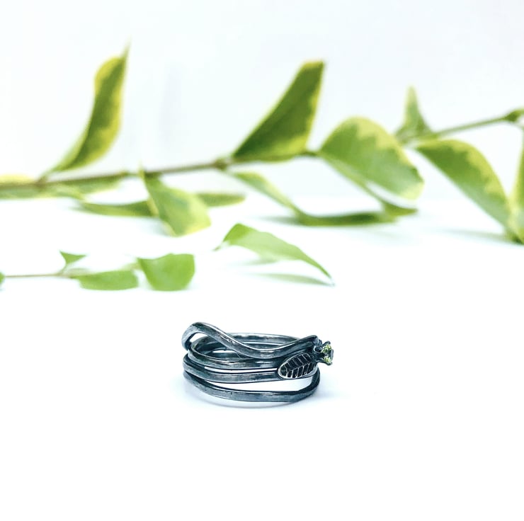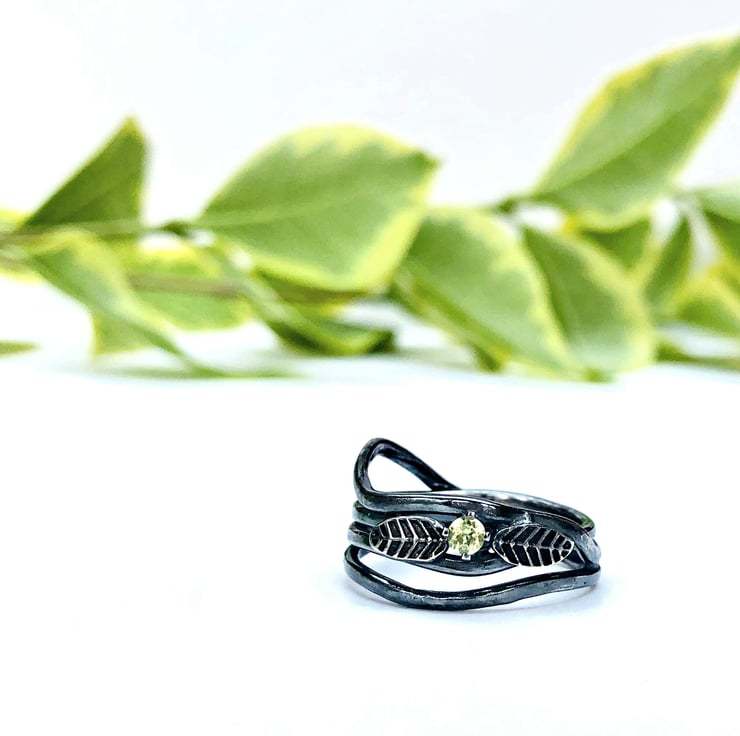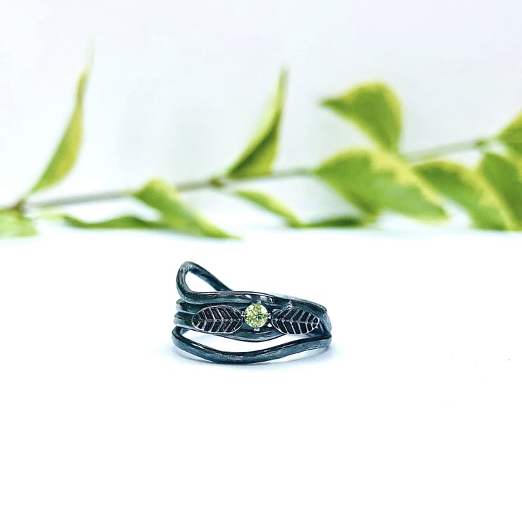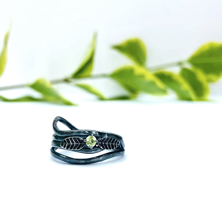 Your oxidised Sterling Silver ring is crafted by hand in our studio based in the Yorkshire Dales. The twisted vines that wrap your finger were inspired by the vines that climb our garden shed. The green Peridot stone is the colour of the leaves.