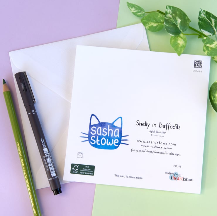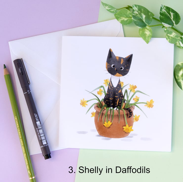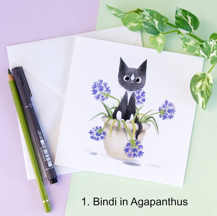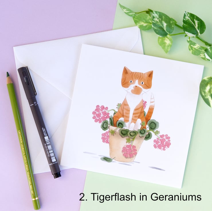 Three (individually sold) cat cards. Each cheeky cat is sitting in a pot of flowers. They're all my own illustrations, originally done digitally. Three designs are available, please make a note of the design number and name in the photos and then select which you'd like from the drop down menu.