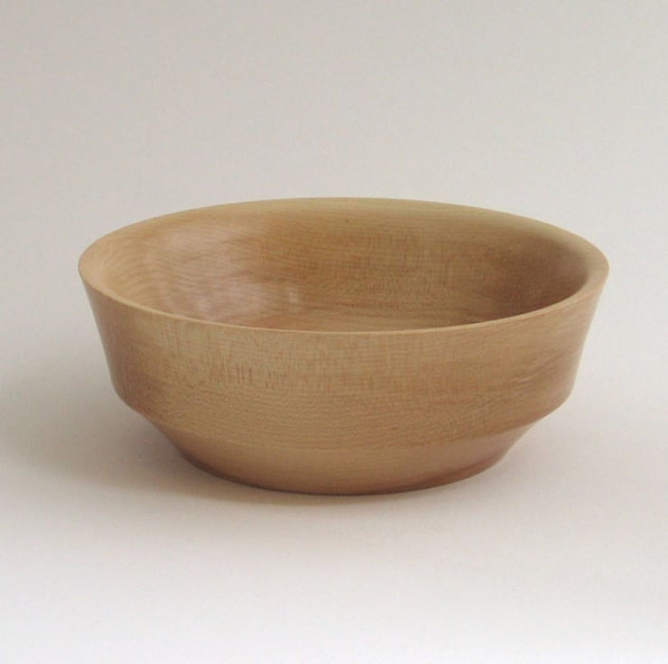 This bowl has been turned in sycamore and finished with a hard lacquer that may be wiped clean. The foot has been angled with gentle curves to elevate the appearance.