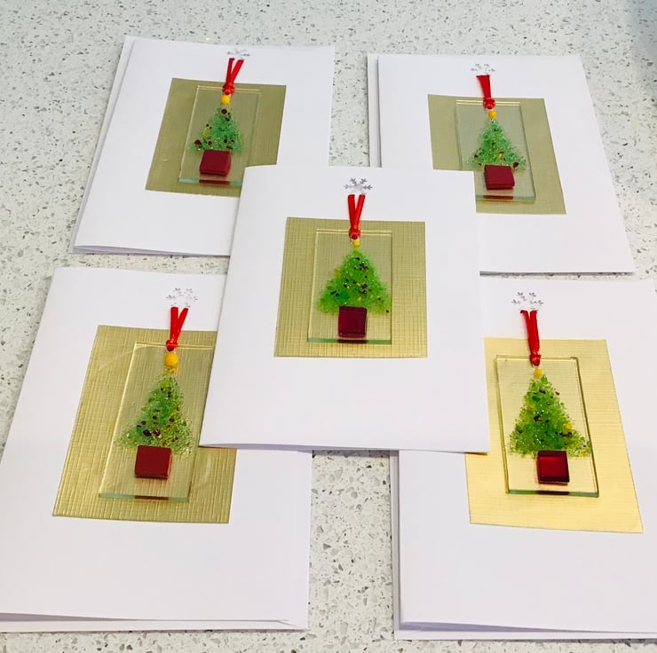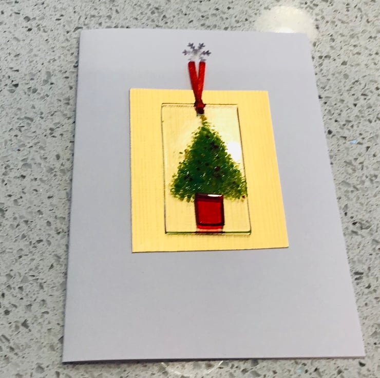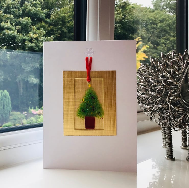 A detachable keepsake Christmas tree decoration on a gold foiled card . A drilled and strung with red ribbon Christmas tee can be kept after the card is no longer wanted as a nice keepsake decoration for your tree or anywhere you may like them .