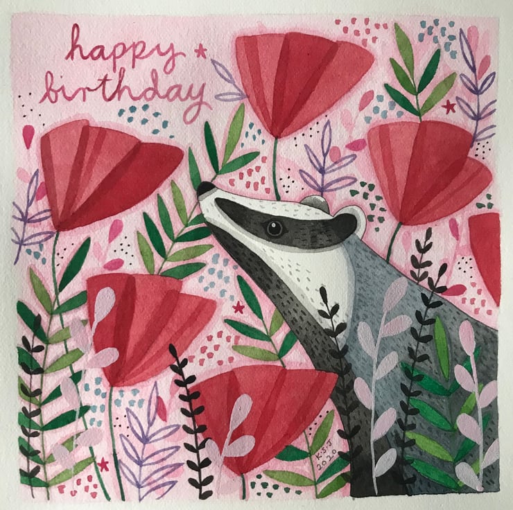 Poppy Badger is taken from an original artwork I created, inspired by the Bucks countryside. It measures 12.5 cm square, printed on 300gsm board and comes supplied with envelope. Blank inside for your own message.