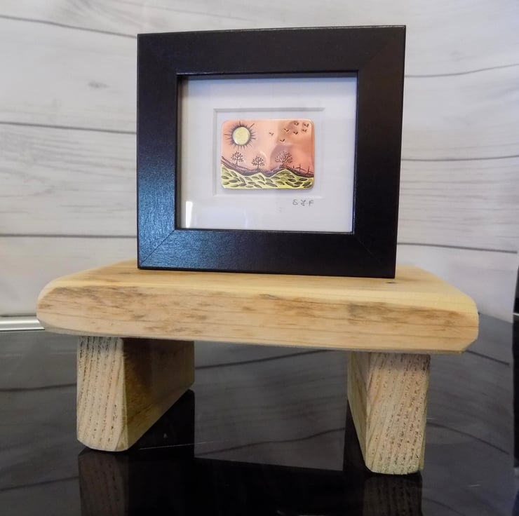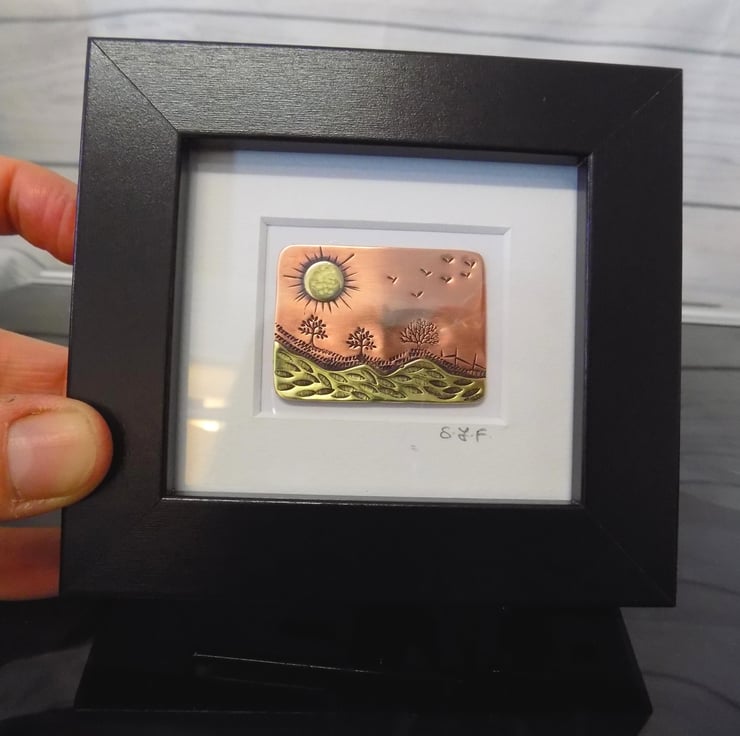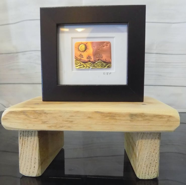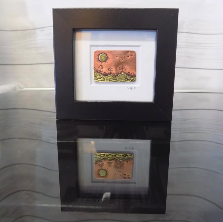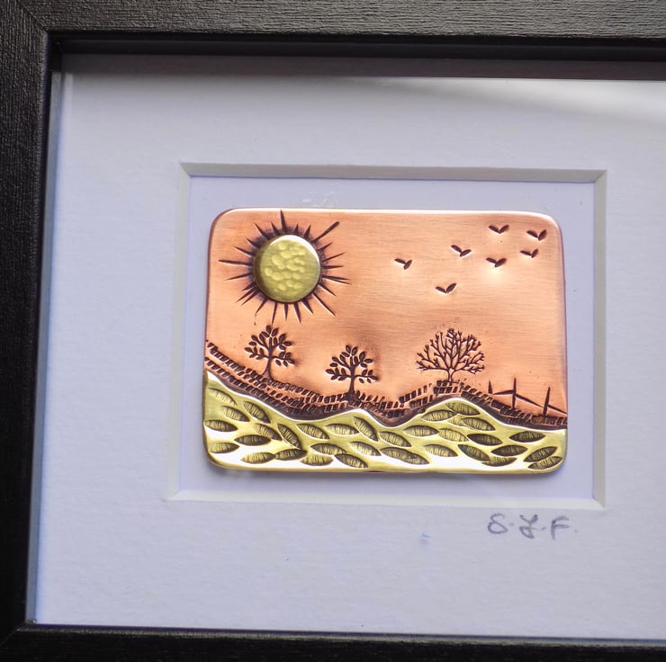Made from copper and brass sheet to create a miniature mixed metal work of art. These are based on my pendants, but slightly bigger and contain more detail. The foreground has a layer of brass which has been carefully soldered to the copper background and has been textured with a punch to give the impression of falling leaves. The background has more texture and trees including a mighty oak tree. The brass sun is shining providing some warmth and a flock of birds are flying away maybe to find a good roosting spot.