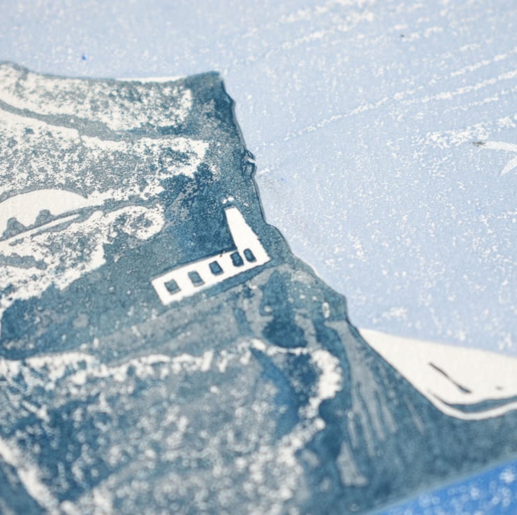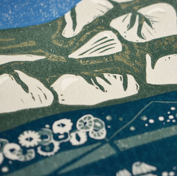 This is an original lino print in a limited edition of just 11. I've used two lino plates, carving some parts for a crisp clean line, and etching others for a more textured appearance. I've layerd up seven colours to produce a rich and complex print.