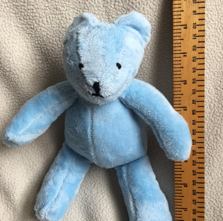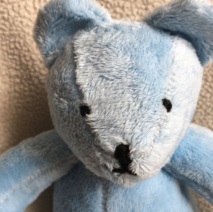 Small plush teddy bear in blue with black embroidered facial features. Polyester fibre filled. Ideal gift for all ages.