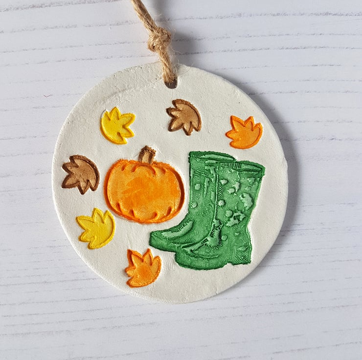 Pumpkin and wellies hanging decoration, one supplied