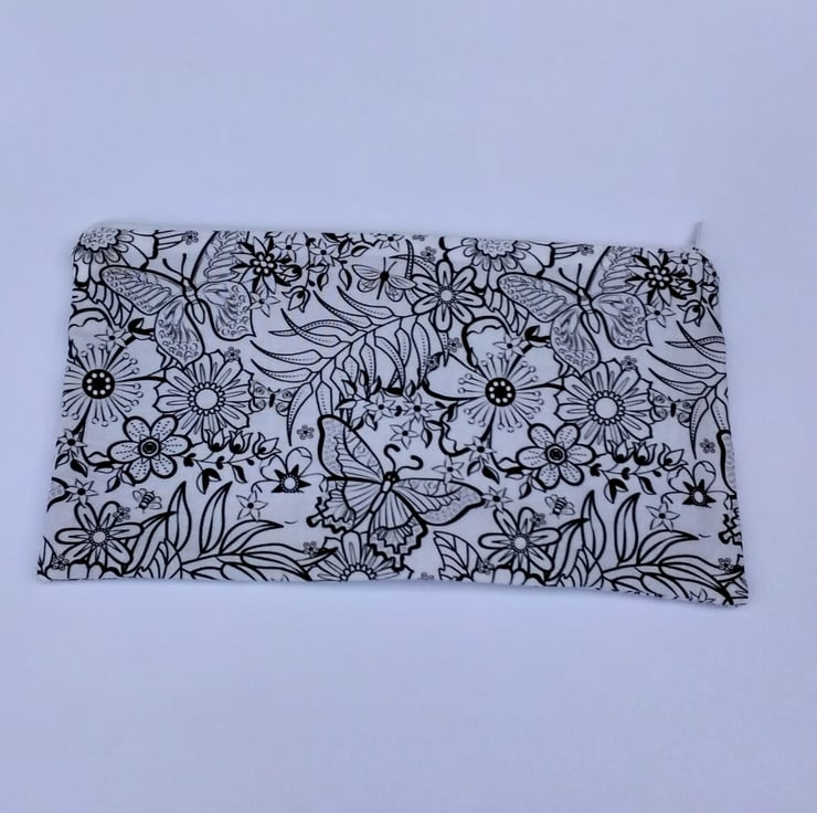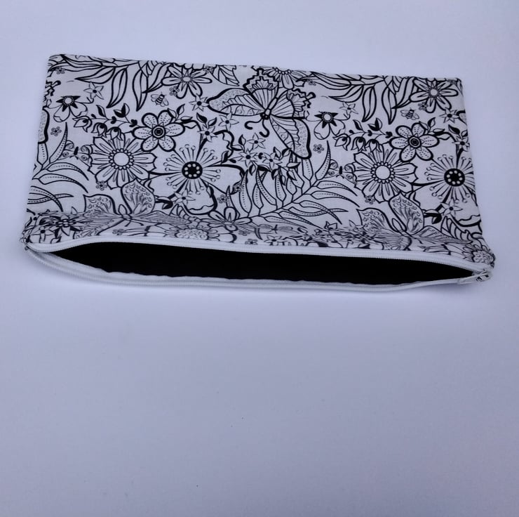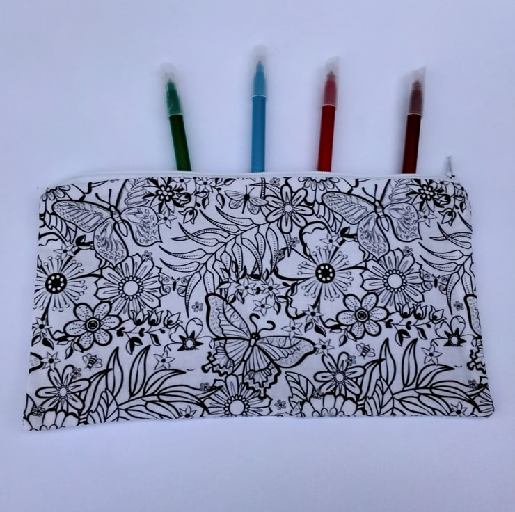This is a pencil case that you can colour in yourself to make it an individual design. The pencil case measures approximately 25cm/ 10inches in length and is approximately 13cm/ 5.25inches deep. The pencil case has been lined with a black cotton fabric.