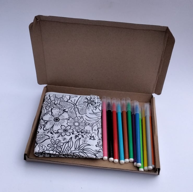 Colour in the pencil case with fabric pens for a permanent design or use washable pens so that you can colour it again and again... You can choose to add either 12 washable pens or 8 textile markers to the box so it would make a great gift idea