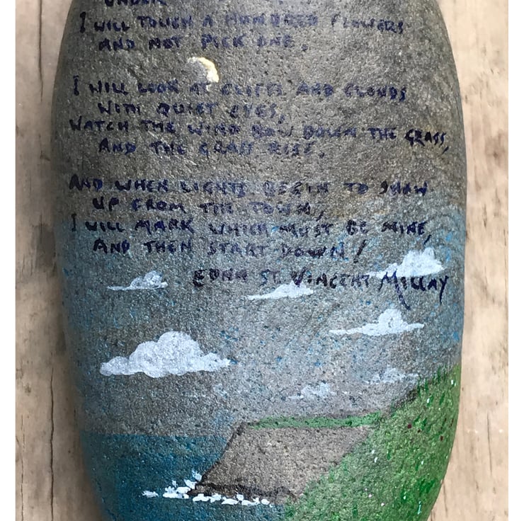 Edna St Vincent Millay's poem Afternoon on a Hill painted on a nicely patterned sea-worn pebble.