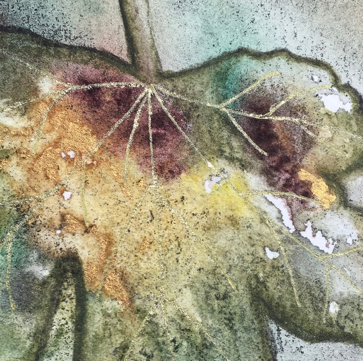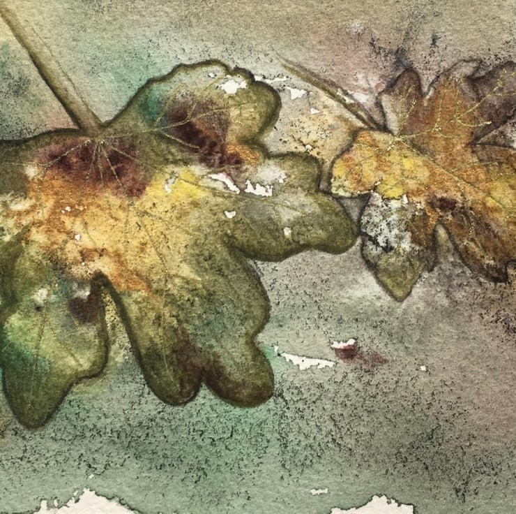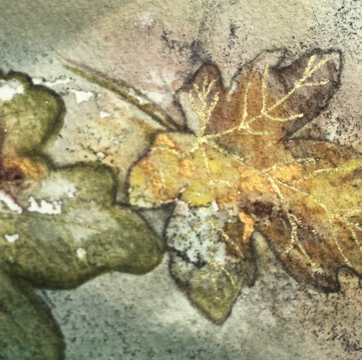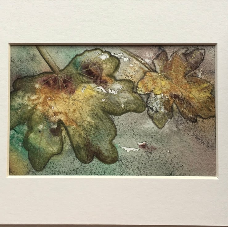 This watercolour painting of field maple leaves will fit a 7” x 5” frame and will be provided with a mount, as shown in the photo. The veins on the leaves have been highlighted in gold but the photos don’t show the full lustre, which is difficult to capture.