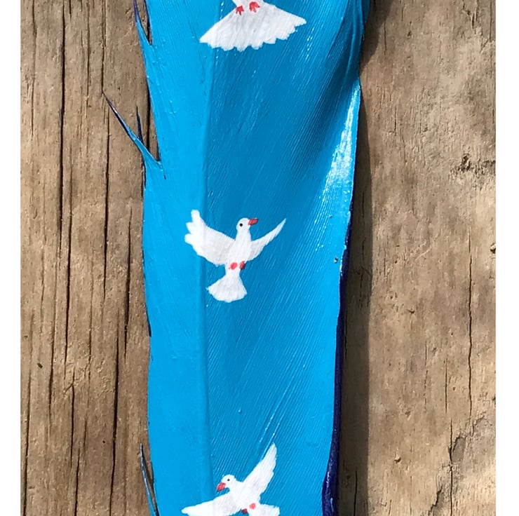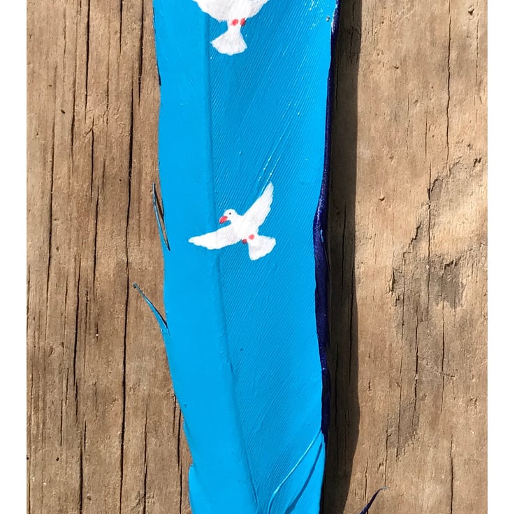 Three doves on a sky-blue background painted on a pigeon feather and sealed with lacquer. A metallic dark blue covers the back of the feather.