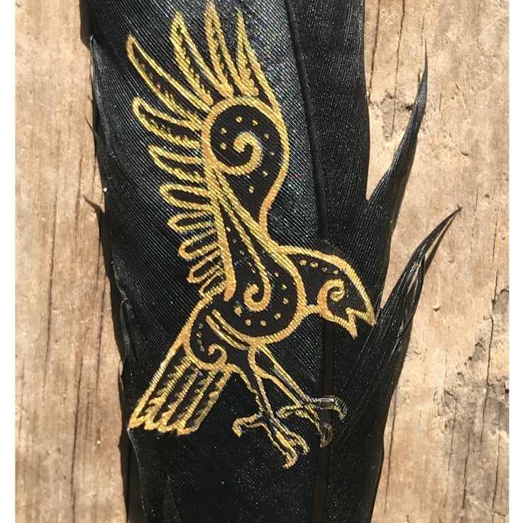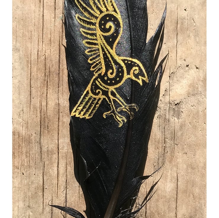 A stylised image of a Raven painted in gold on a Jackdaw feather.