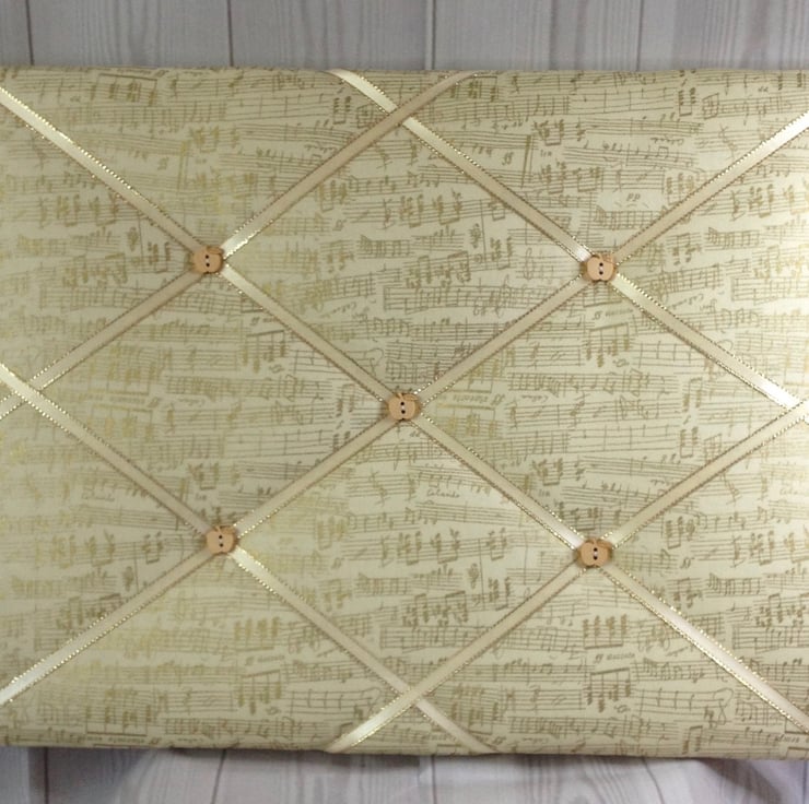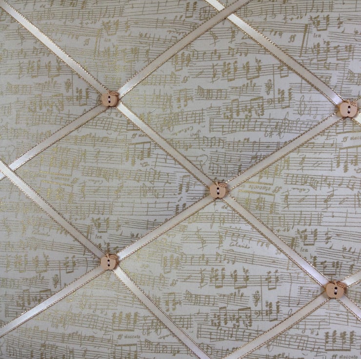 Padded fabric notice board in a music score print cotton. Ribbon in a diamond design with buttons to secure. Back is covered with felt.