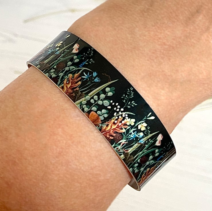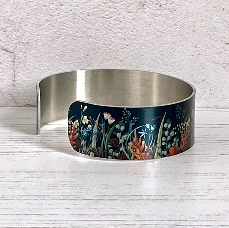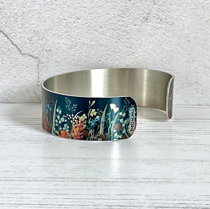 Handmade cuff bracelet with an oak leaf and wildflowers design. Matching pendant and earrings are available. This can have an engraved personalised message on the reverse for a small extra fee (optional)
