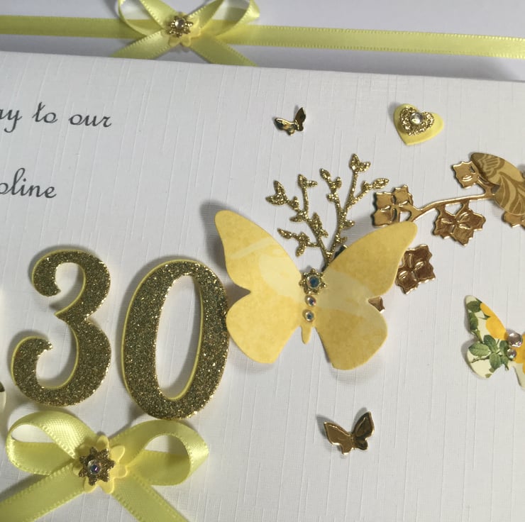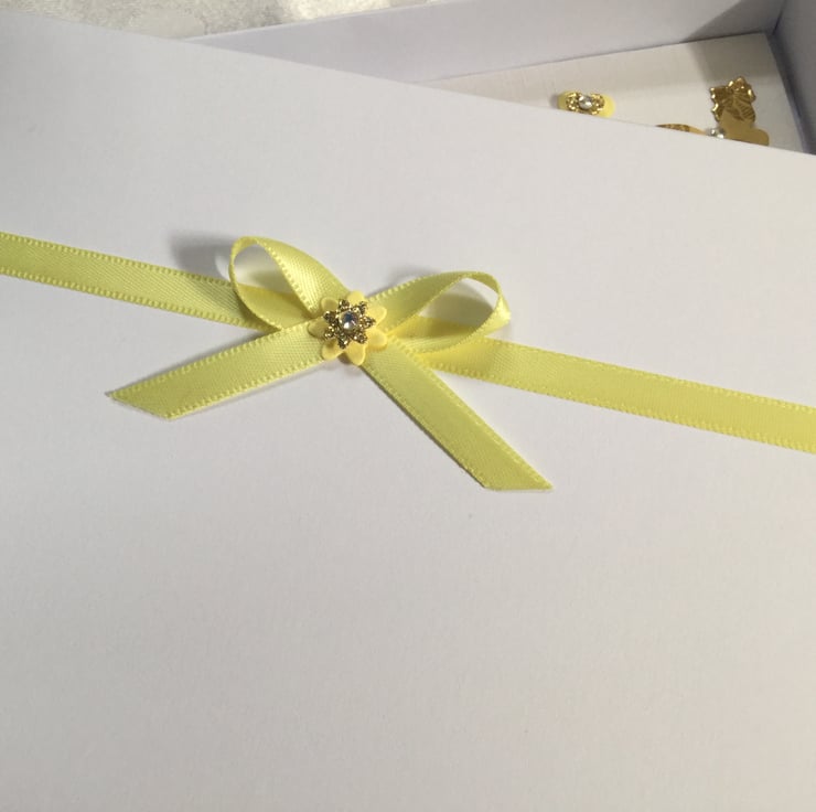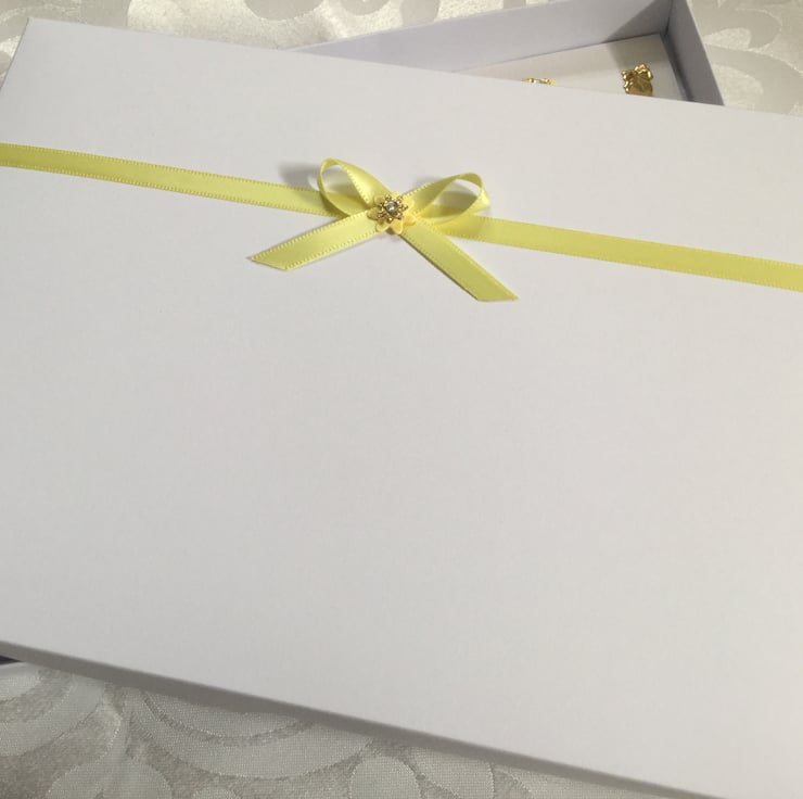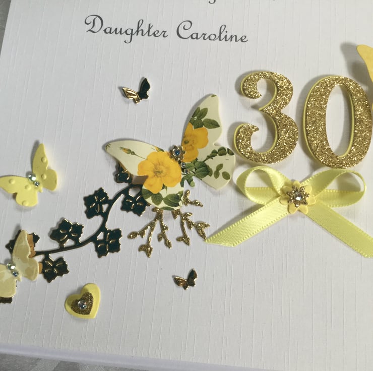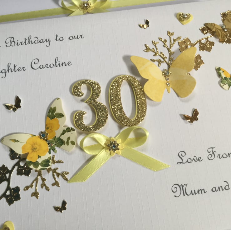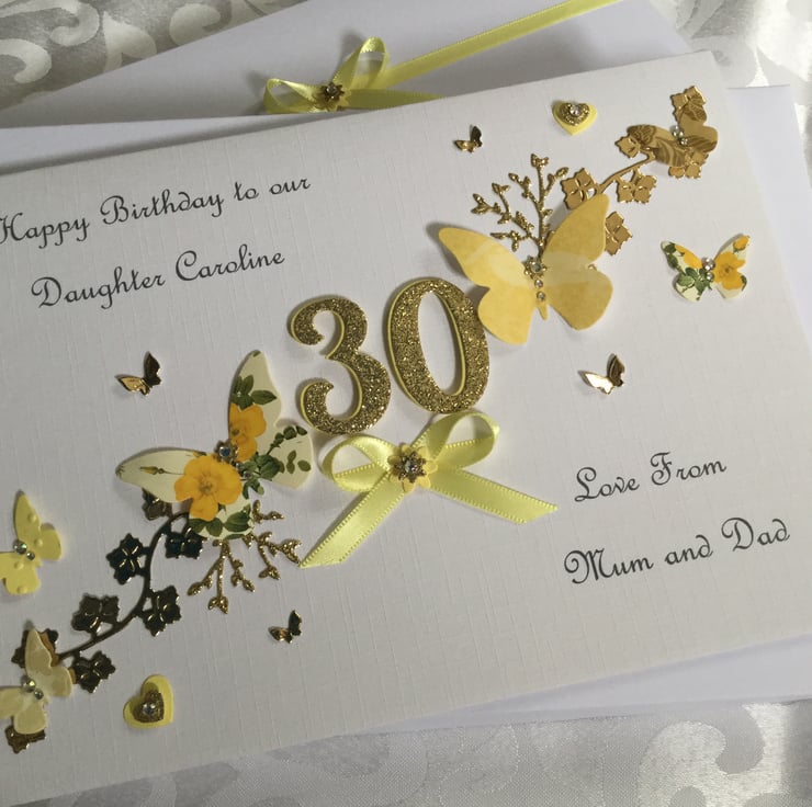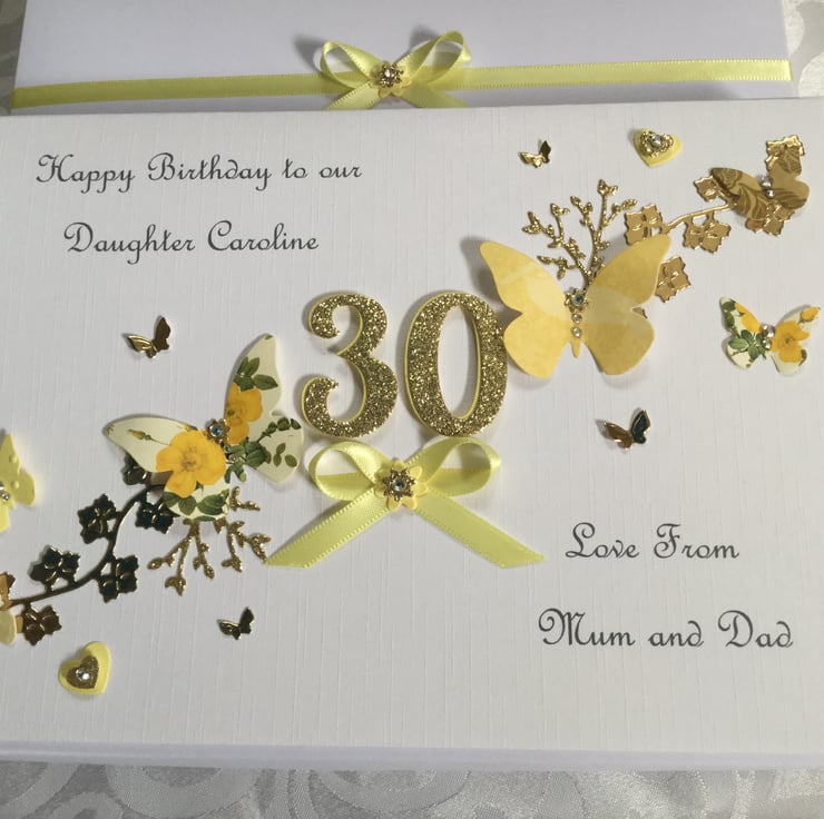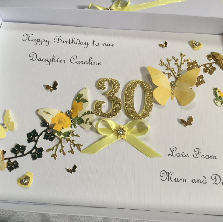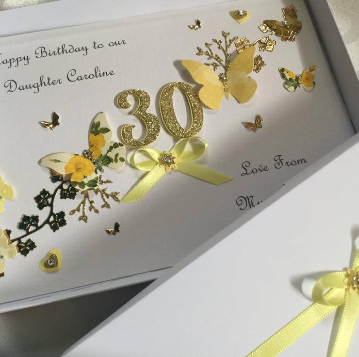 This handmade gift boxed card is A5 in size (210mm x 150mm) and can be personalised for any special birthday. It is on 300gsm cardstock and decorated with ribbons and gems. It comes in the matching decorated box and makes a wonderful keepsake.
