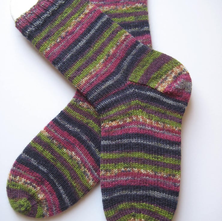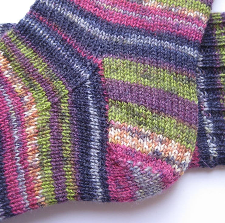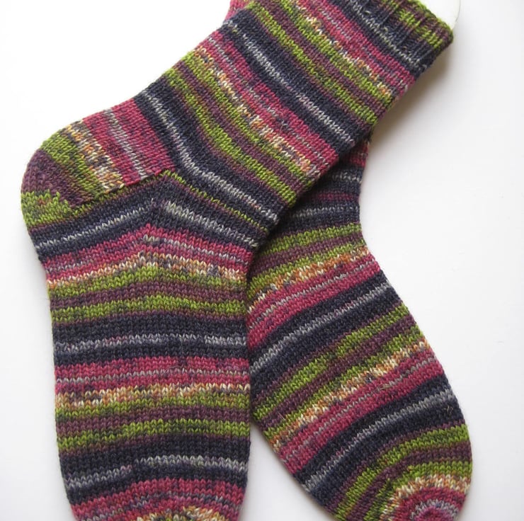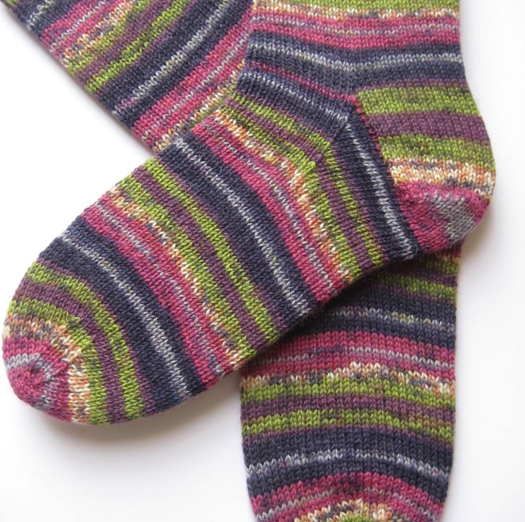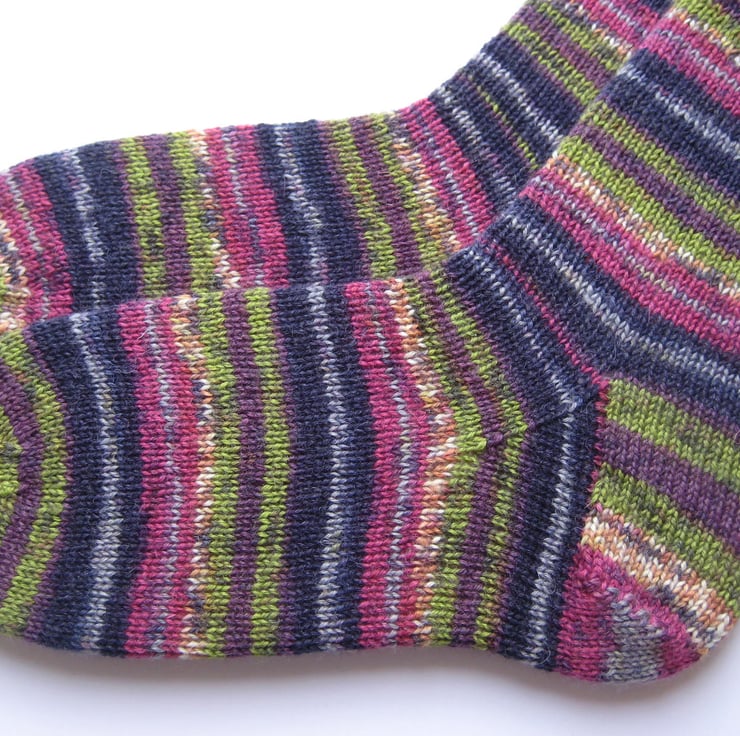 Hand knitted in the round on 5 double pointed needles, these mismatched wool socks are made from Fabel 4 ply self patterning sock yarn (75% wool 25% polyamide yarn) in shades of purple, green, blue and pink. Made from very fine yarn, they are not too thick and will fit most footwear. Warm and durable, these socks will keep your feet comfortable and bright throughout the year.