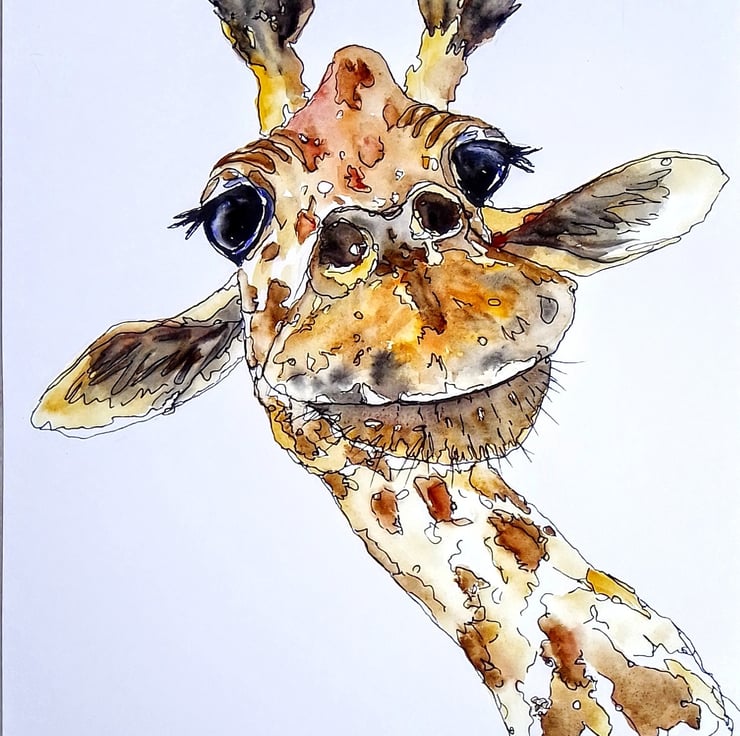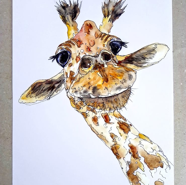An original watercolour and ink painting on quality paper of a cute giraffe.