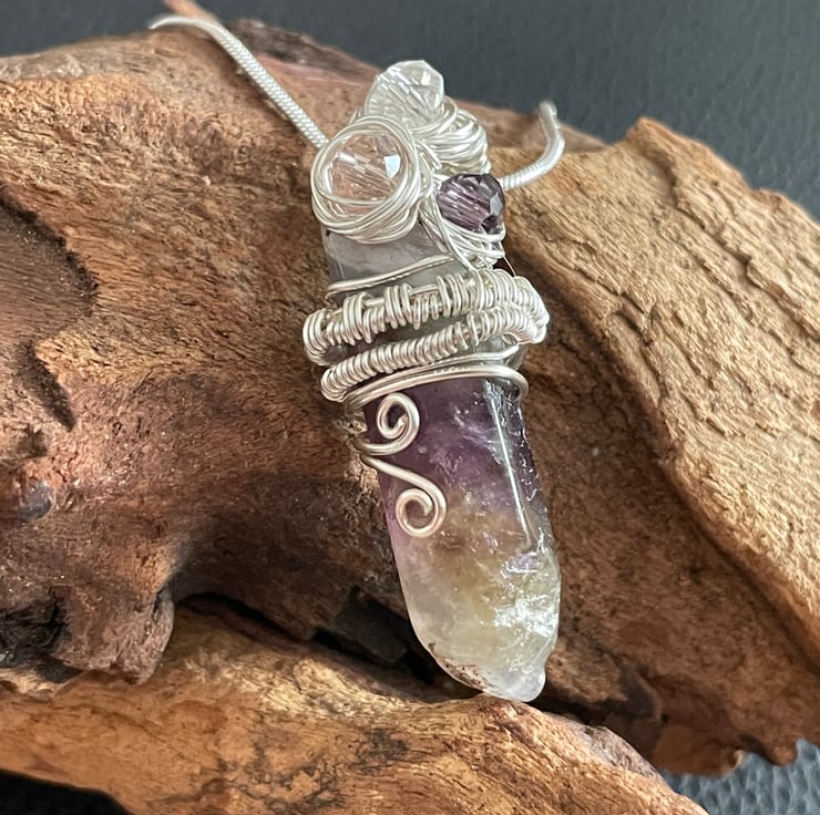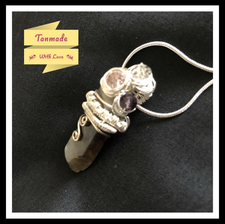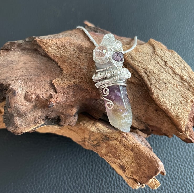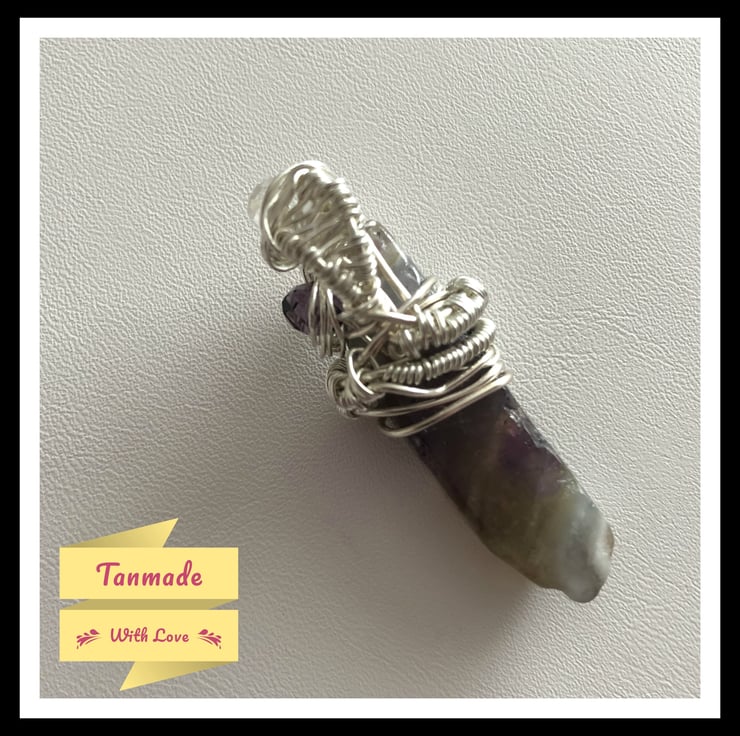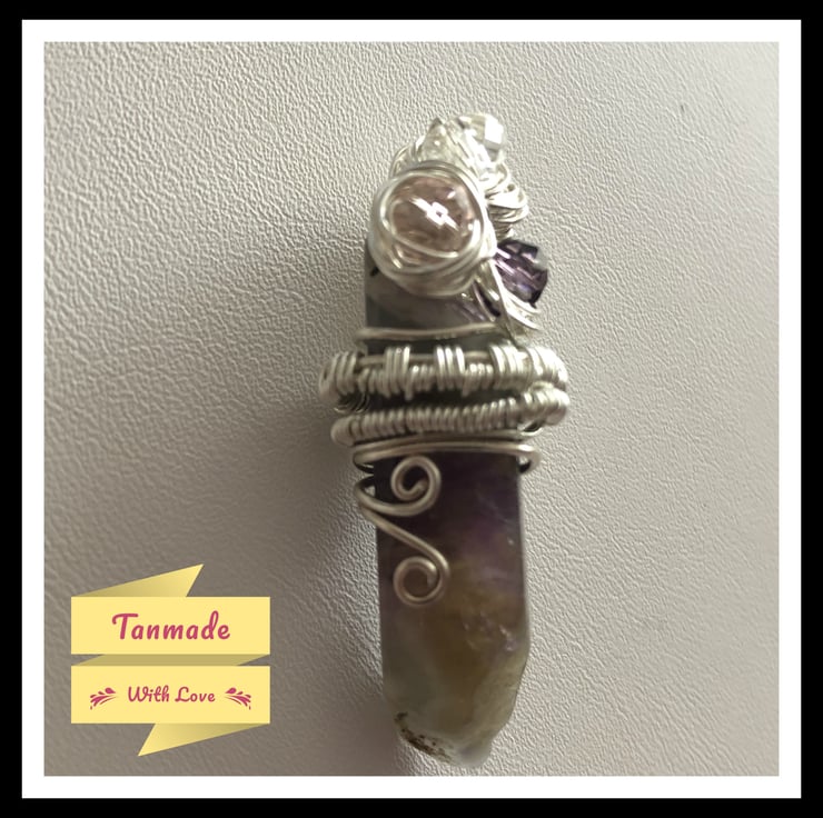 Created with a natural Amethyst crystal point and wrapped by hand using a multi coloured trio of 6mm glass faceted bead embellishments. The wire is a silver plated artistic copper that has an ultra thin coating which will inhibit tarnishing for longer. Measures approximately 4cm