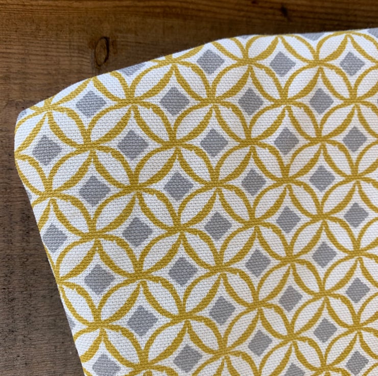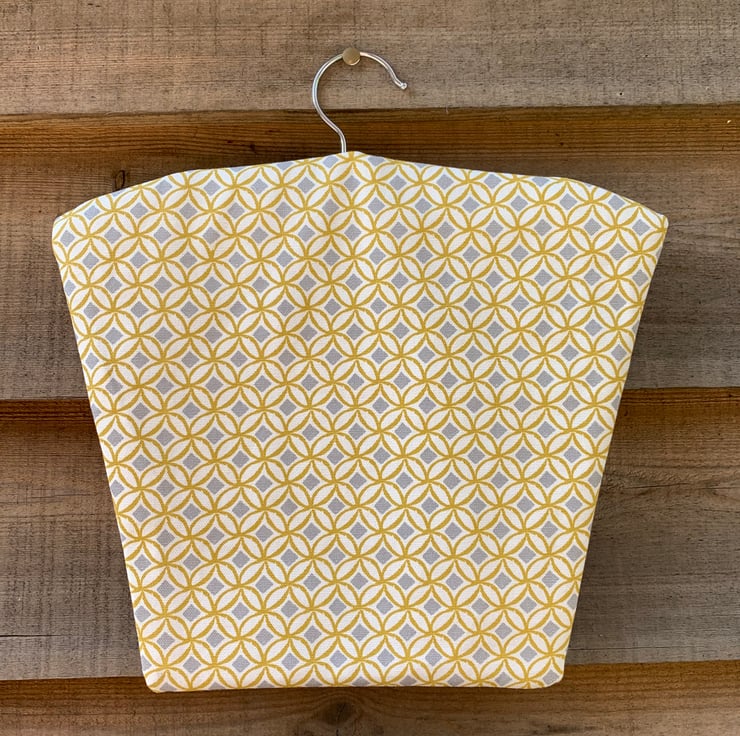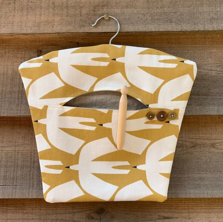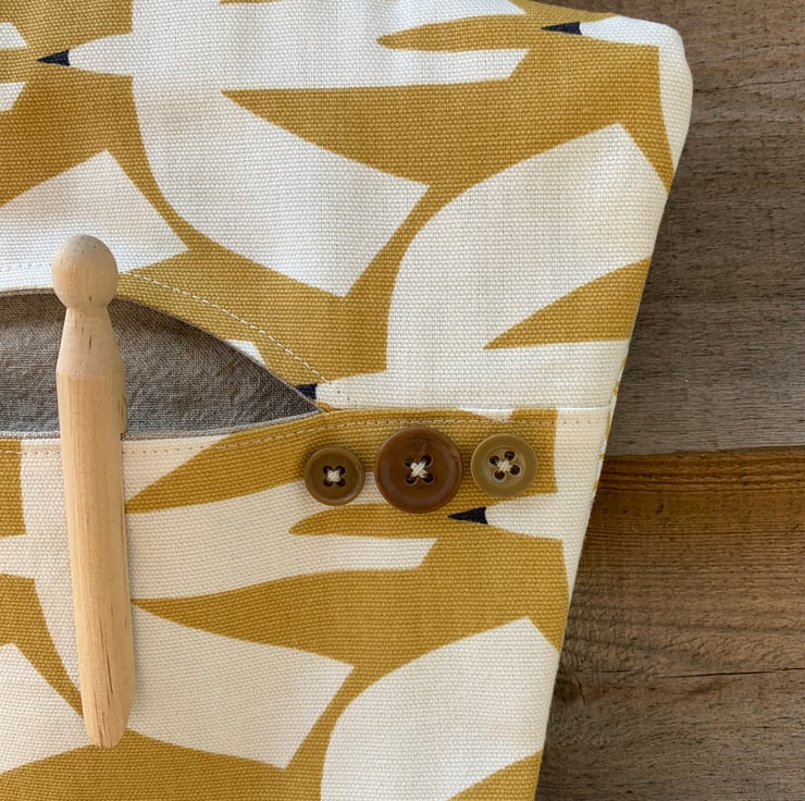 Pretty yellow peg bag in Scion pajaro cotton backed with a coordinating print. The peg bag is fully lined in a neutral fabric and trimmed with 3 buttons.