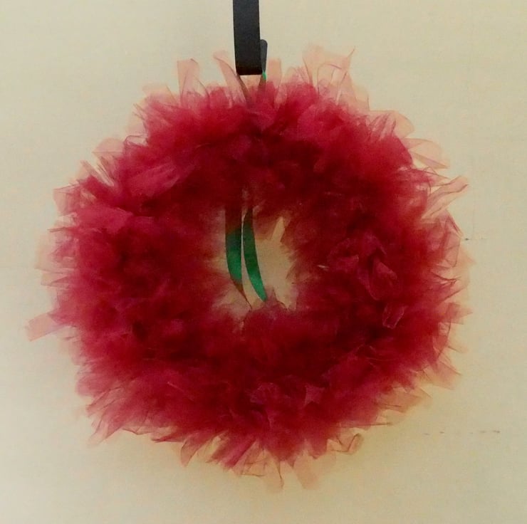 It’s made from red netting tied onto a metal frame. The ribbon on the back can be adjusted to hang the wreath lower or higher.