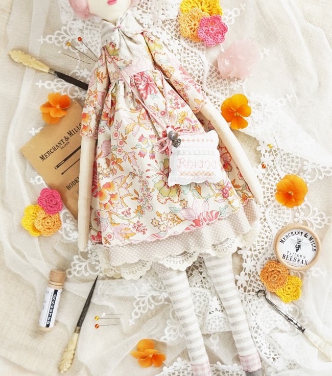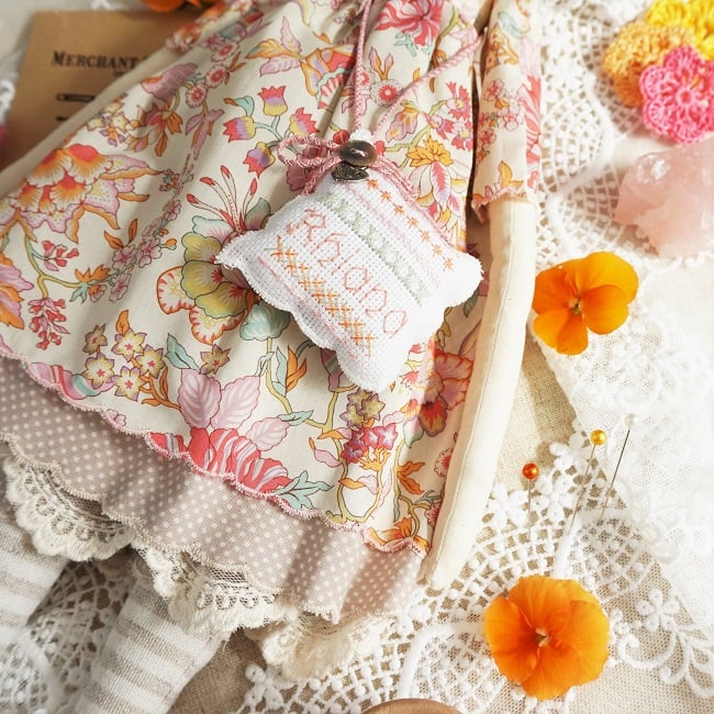 Rhiana is a cloth doll made with a tea dyed calico body and a hand embroidered face. She is made to my own pattern. She has hand stitched and styled wool tops for hair in a warm pink colour. She sports a very jaunty cream coloured crochet hat. Her dress is a Liberty Tana Lawn Fabric print called Christalle in late summer orange and yellow. She has co-ordinating underskirt & knickers with a white lace petticoat. She sports a little bag with her name embroidered onto it. She stands 50cm tall and has a tiny waist with a plump bottom and she has button joints for her arms. She has a rose quartz crystal heart for love and lavender in her stuffing for a gentle scent. She will sit nicely on a chair or a bed.
