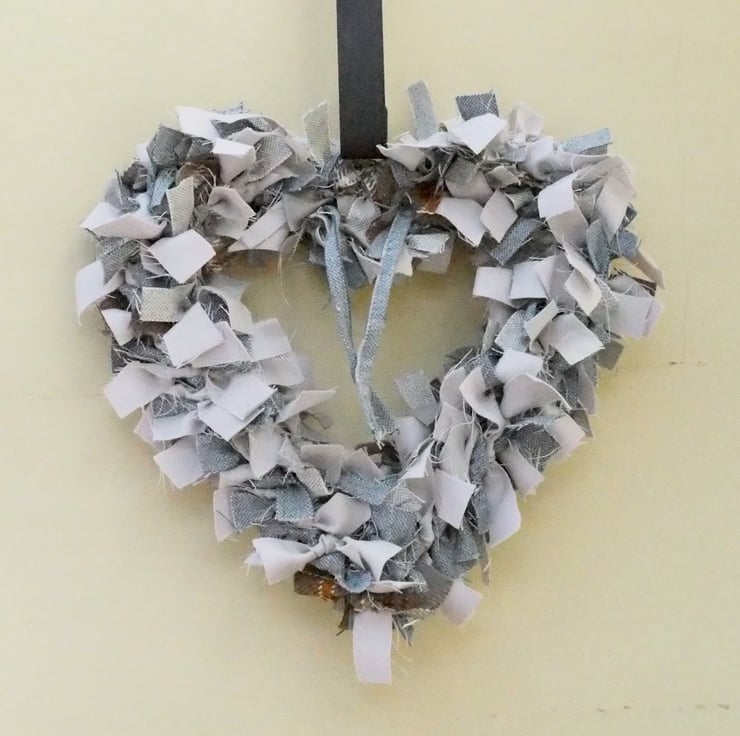 Beautifully soft tweed fabric hand tied onto a heart shaped wire frame. It will look stunning all year round on a wall or door and add a touch of glamour to any room.