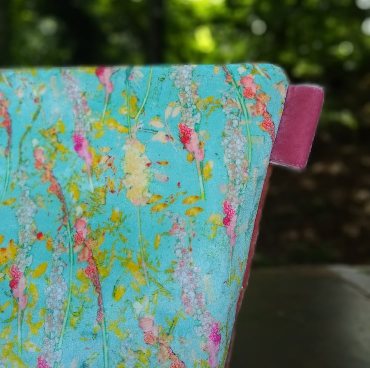 Backed in lovely, soft, salmon pink up-cycled velvet, lined in washed calico, a felt-lined velvet strap and finished with a swivel clip, embroidery thread and button detail, this would make a decorative and useful gift for a maker.
