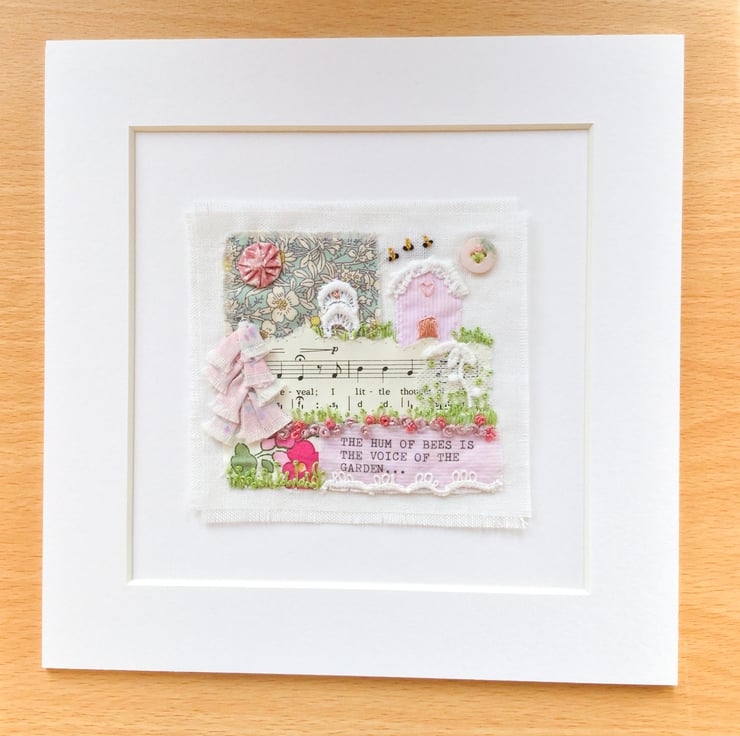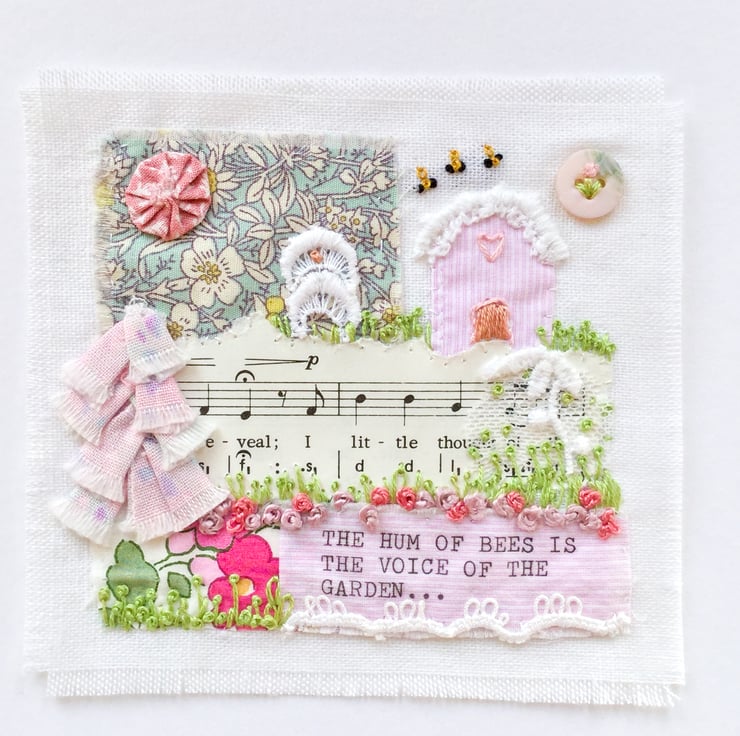 Textile collage made using a variety of different media and techniques. A layered design using linen, lace, hand embroidery and vintage sheet music. A foxglove has been appliquéd along side a pink chicken coop and a lace beehive.