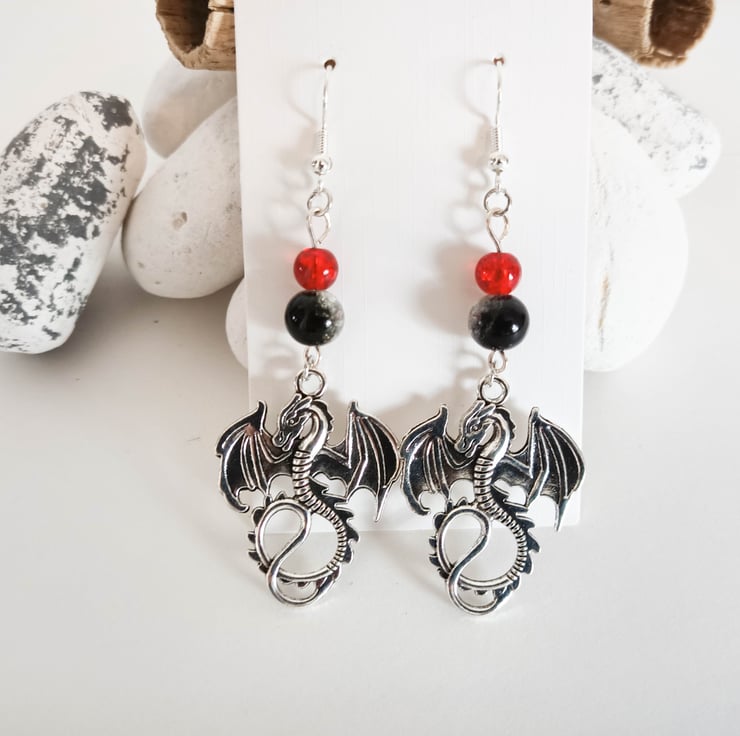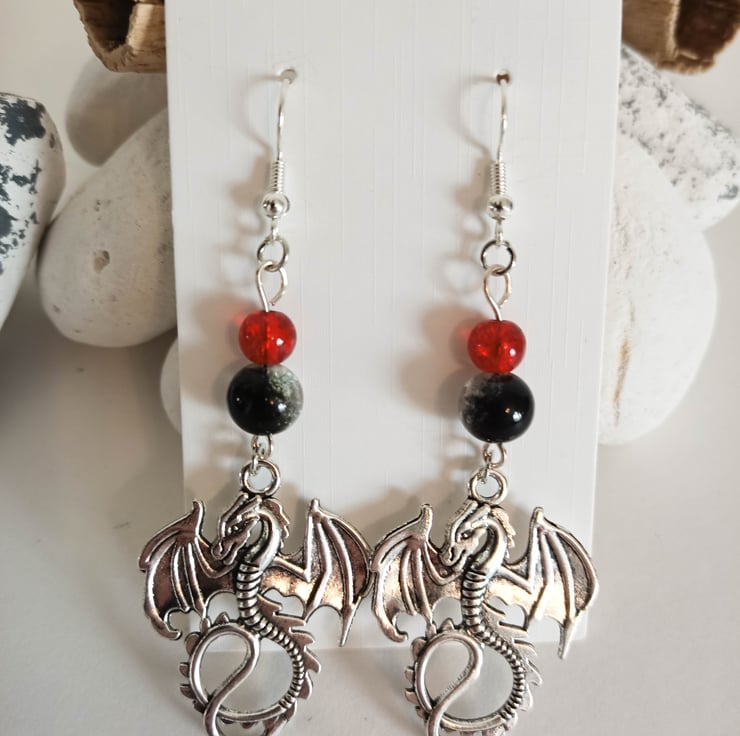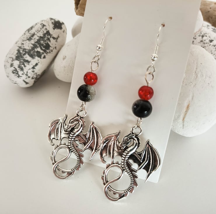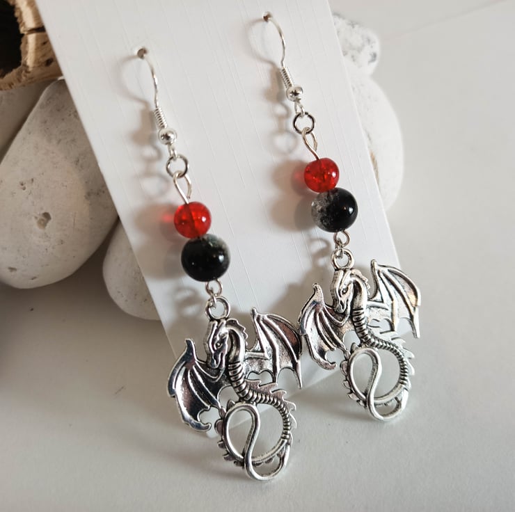 These earrings feature dragon charms hanging from a small red and larger black and clear crackle beads. The dragon charms are approx 35mm x 25mm.