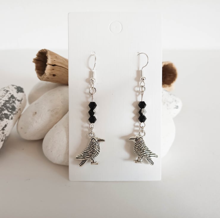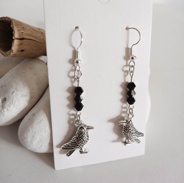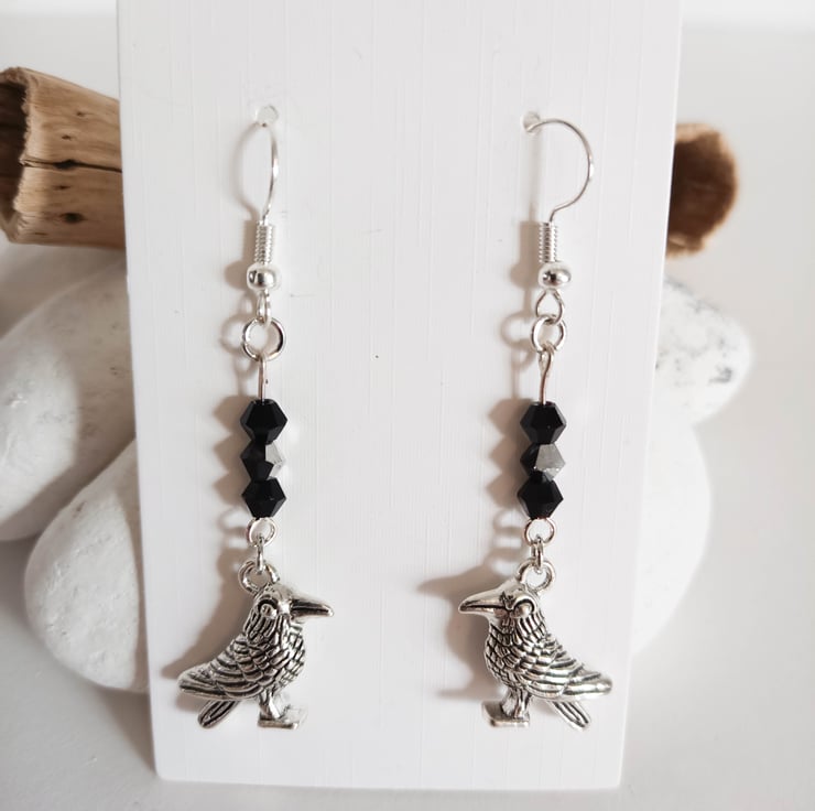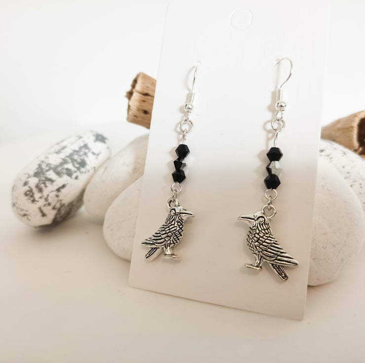 These halloween or gothic style earrings feature two antique silver crow charms and above the charms are rows of three bicone beads; black bicone beads on the top and bottom and the middle black/silver. The crow charms are 14mmx18mm in size.