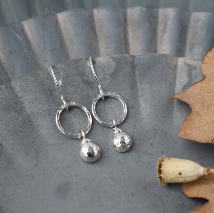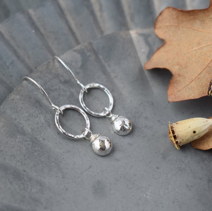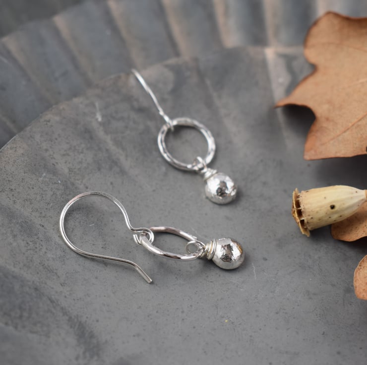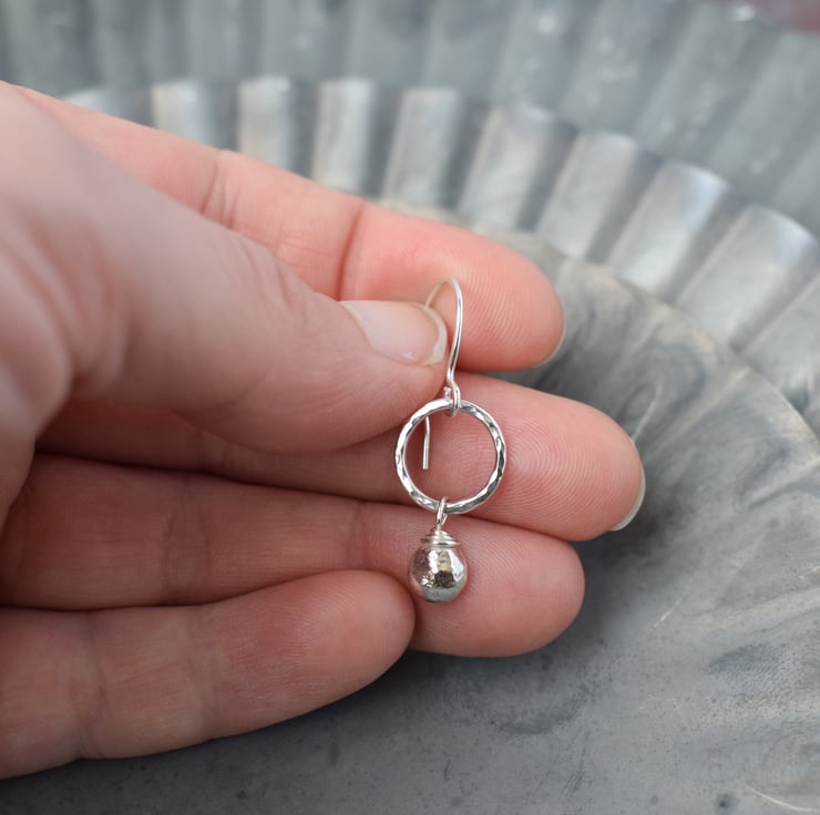 Hammered silver hoops couple with a wire wrapped silver droplet, formed from silver offcuts recycled in my home studio. The silver is melted to produce a rustic, flat-backed pebble shape and textured finish which is polished to catch the light when worn. As such, each pebble is one of a kind and may vary slightly in shape and finish. The earrings are finished with handcrafted sterling silver ear wires which are tumbled for strength.