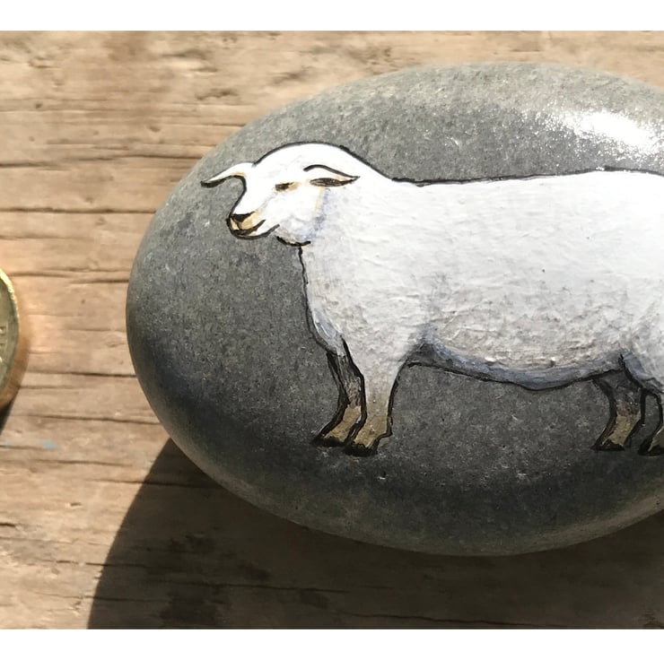 A traditional Dorset breed sheep painted on a smooth sea-worn pebble from a Dorset beach.