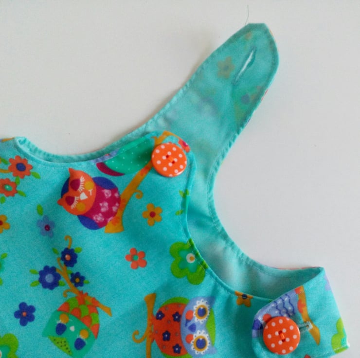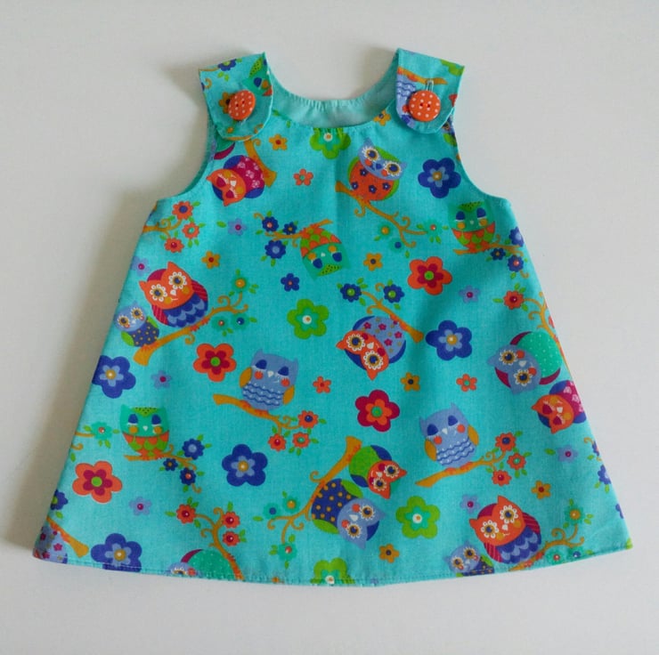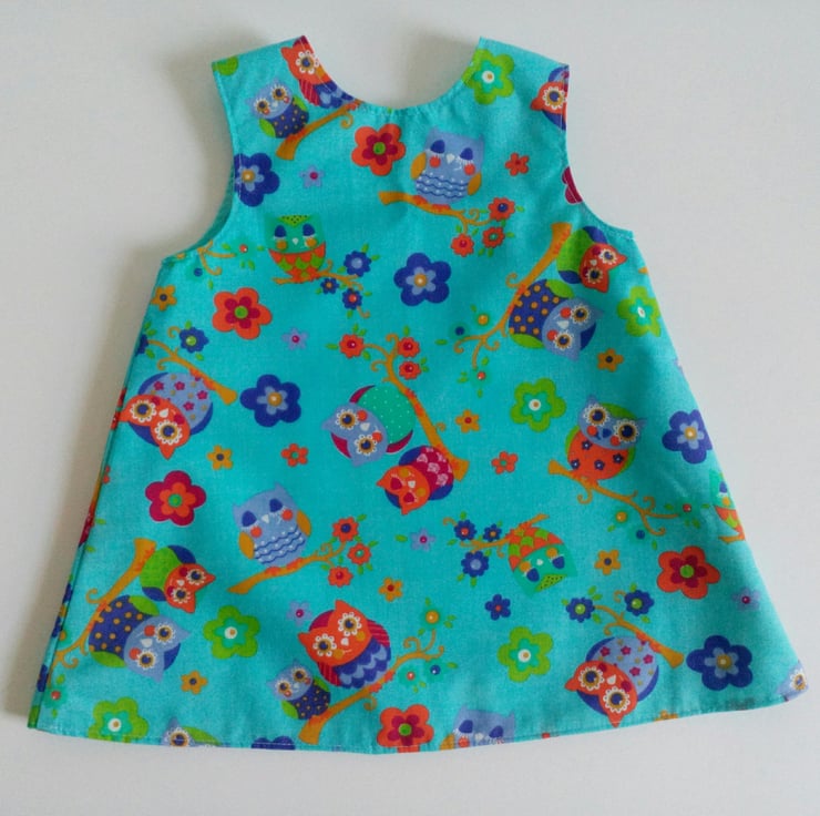 A Lined, A line style dress/pinafore in pale blue with Owl and flowers design.