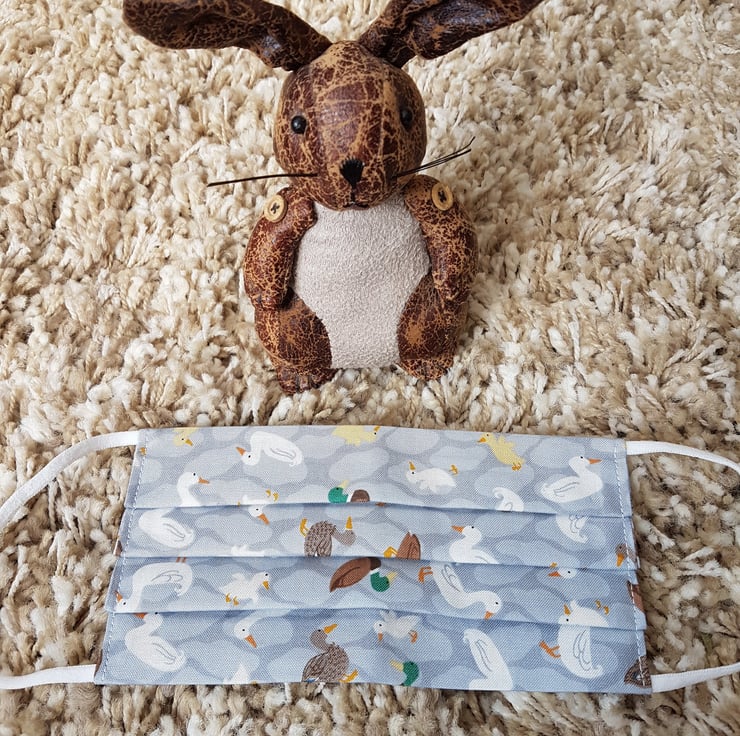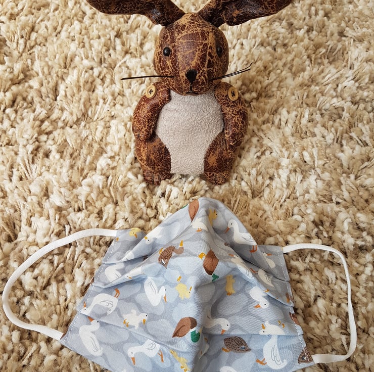 Adult face covering made from an assorted duck print on light grey cotton. The face mask is made with 2 layers of cotton forming an inner pocket for a filter (not included) and is fastened over the ears with 2 loops of elastic and a toggle adjuster.