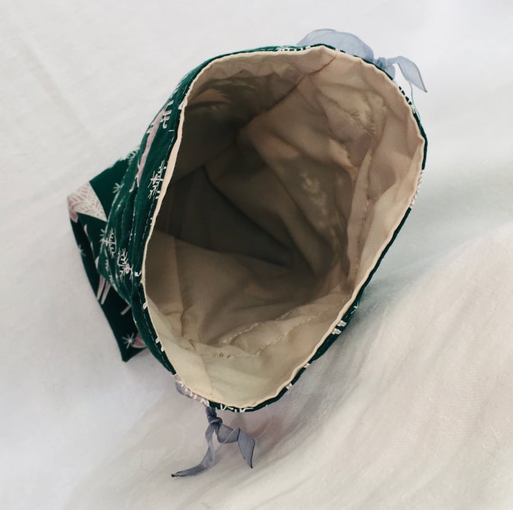 The bag has been made using tight weave quilting cotton and fully lined in a plain colour cotton, finished with organza ribbon to pull the bag shut and then can be tied into a bow, ready to present.