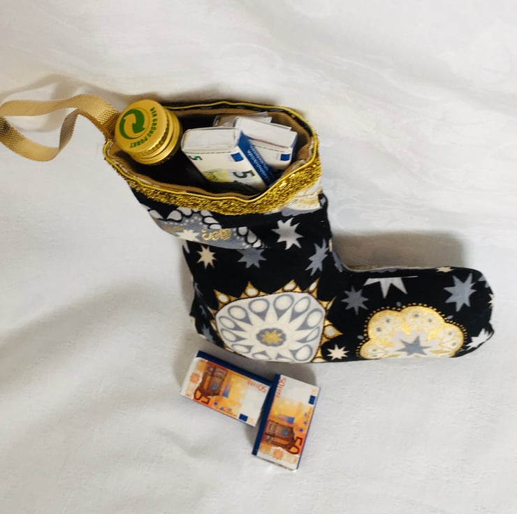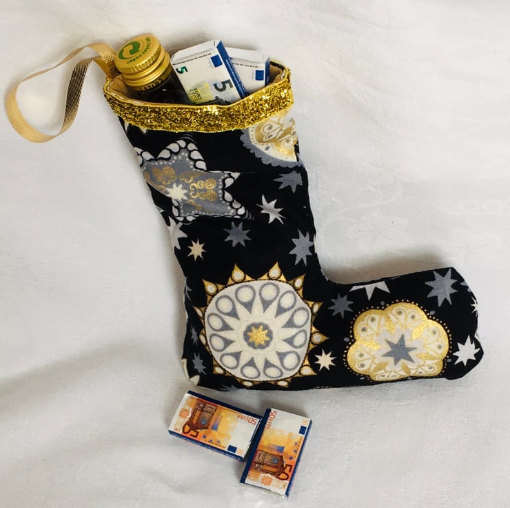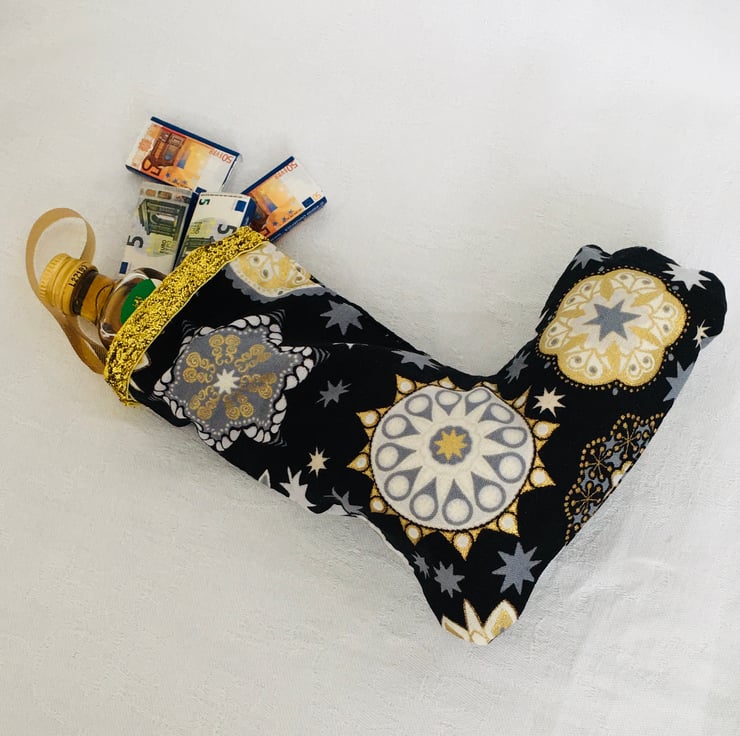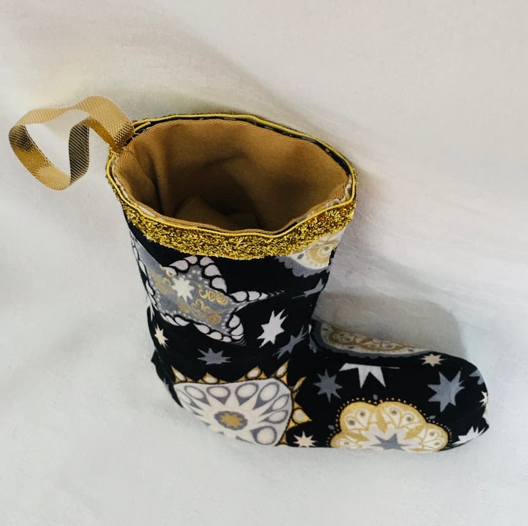 The stocking has been made with tight weave quilting cotton and fully line in a plain colour cotton. Then embellished with gold glitter ribbon trim.