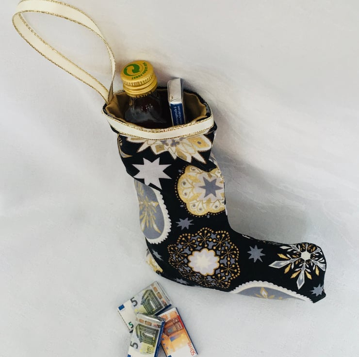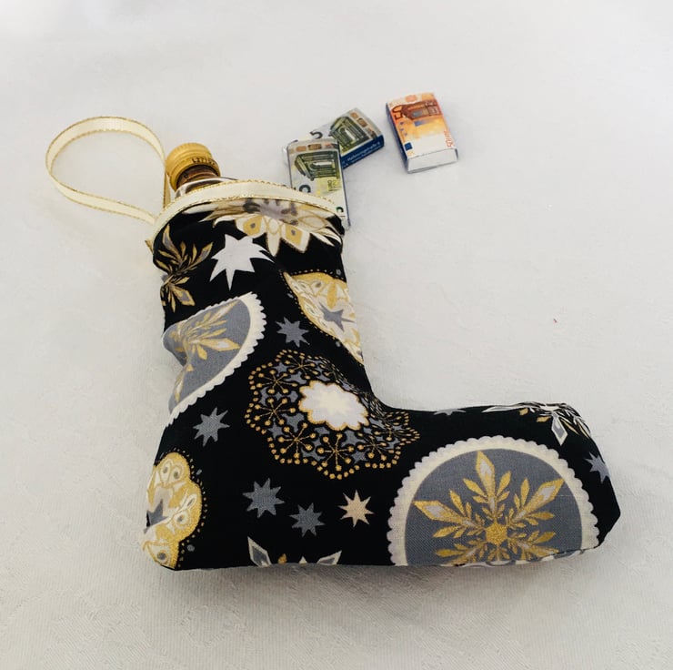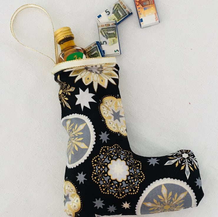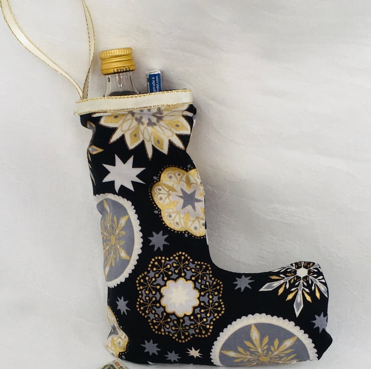 Here we have a small Christmas stocking, that can be hung on the tree or mantle place, filled with little treats. This stockings are great place on the dinner table for each person, filled with a miniature bottle for the adults and sweets for the children, a nice little touch and another surprise.