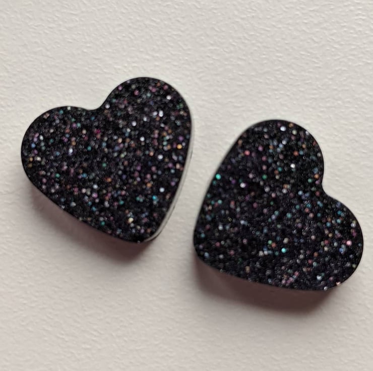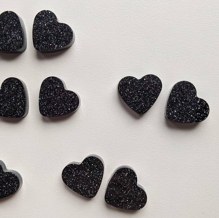 Black and glitter flecked, these black hearts can go on the small silver plated hoops or be a stud earring! (Surgical steel stud)