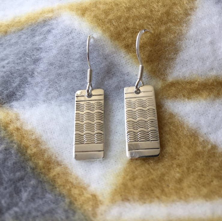 These earrings match the necklace made from a 1936 Birmingham engine turned necklace.They measure 1.9cm by 0.8cm and have new silver hook wires.