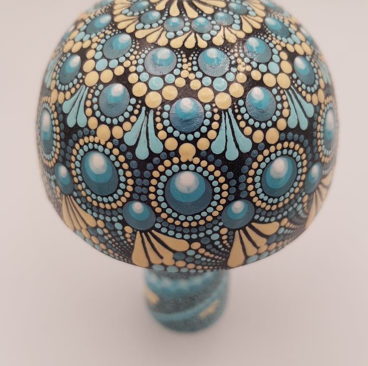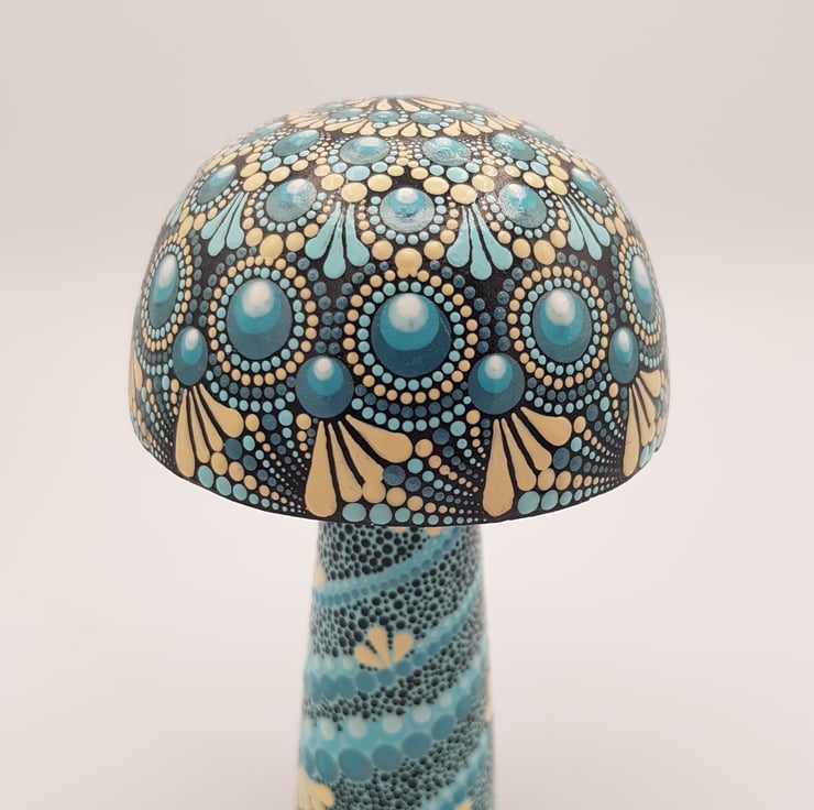 Wooden decorative mushroom, measures 14cm tall and 8.5cm at the widest point.