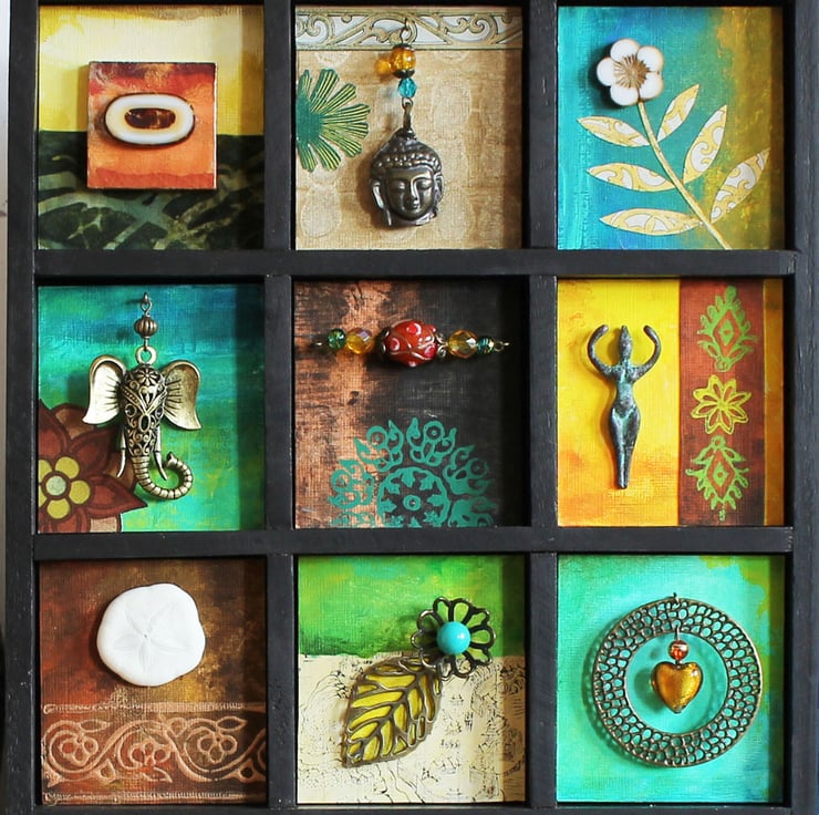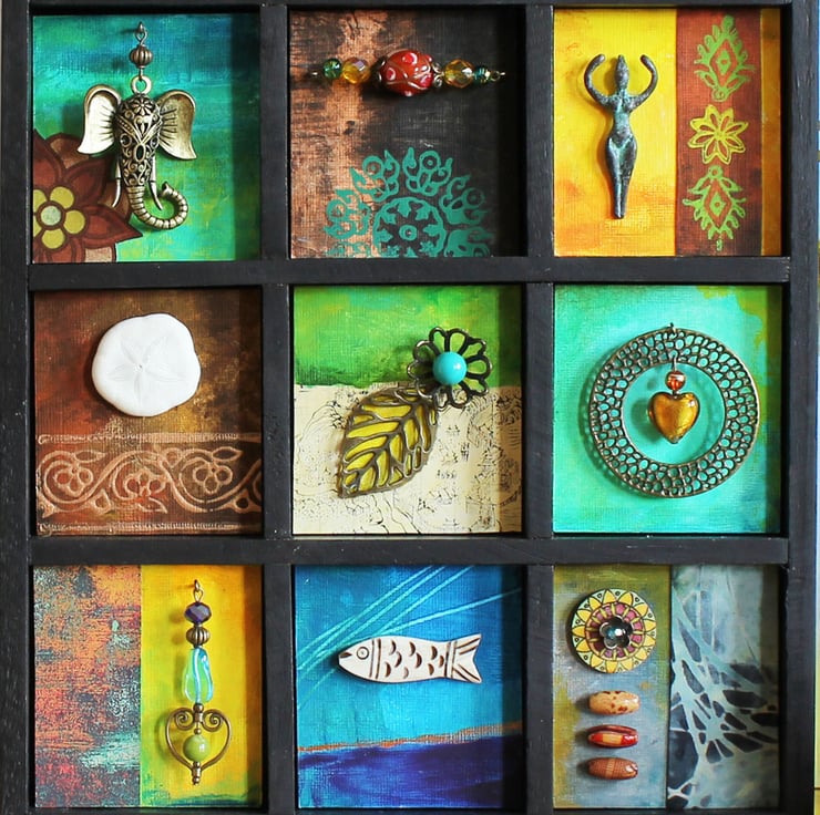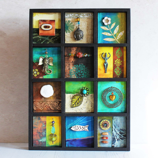 The artwork is housed in a sturdy wooden compartment box which has been painted with black acrylic paint. Inside the sections have been given a vintage feel with layers of paint, woodblock prints and decorative papers from old books.