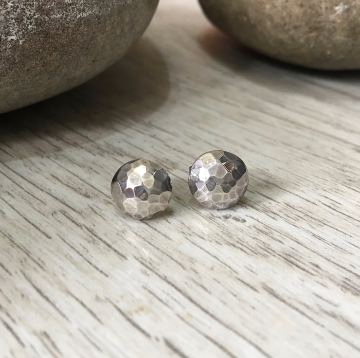Handmade from sterling silver these simple stud earrings are eye catching and comfortable to wear. The studs are hammered to mimic the surface of the moon and the facets reflect the light beautifully.