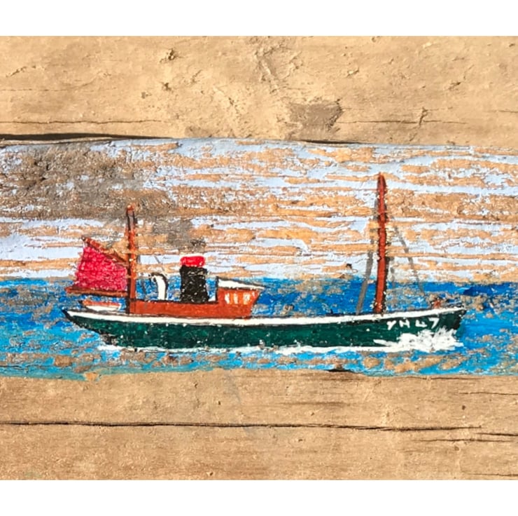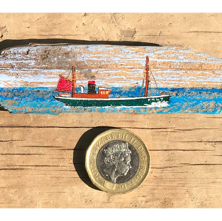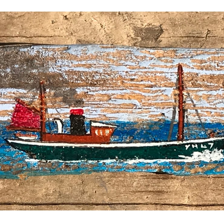 An old Steam Drifter fishing boat, as used by the East Coast Herring Fleet, painted on a small piece of driftwood.