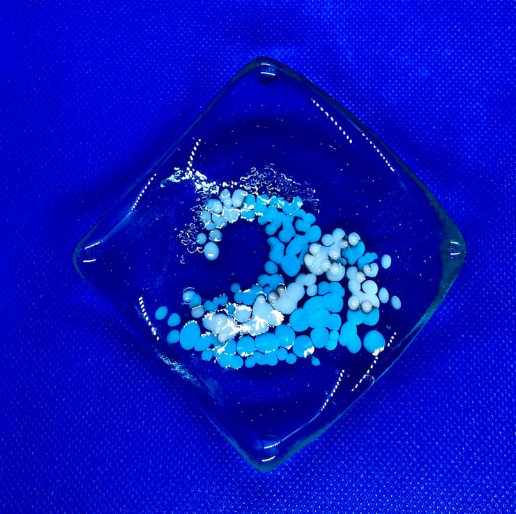 This dish in pale blue transparent glass features a breaking wave in reactive blue and white.